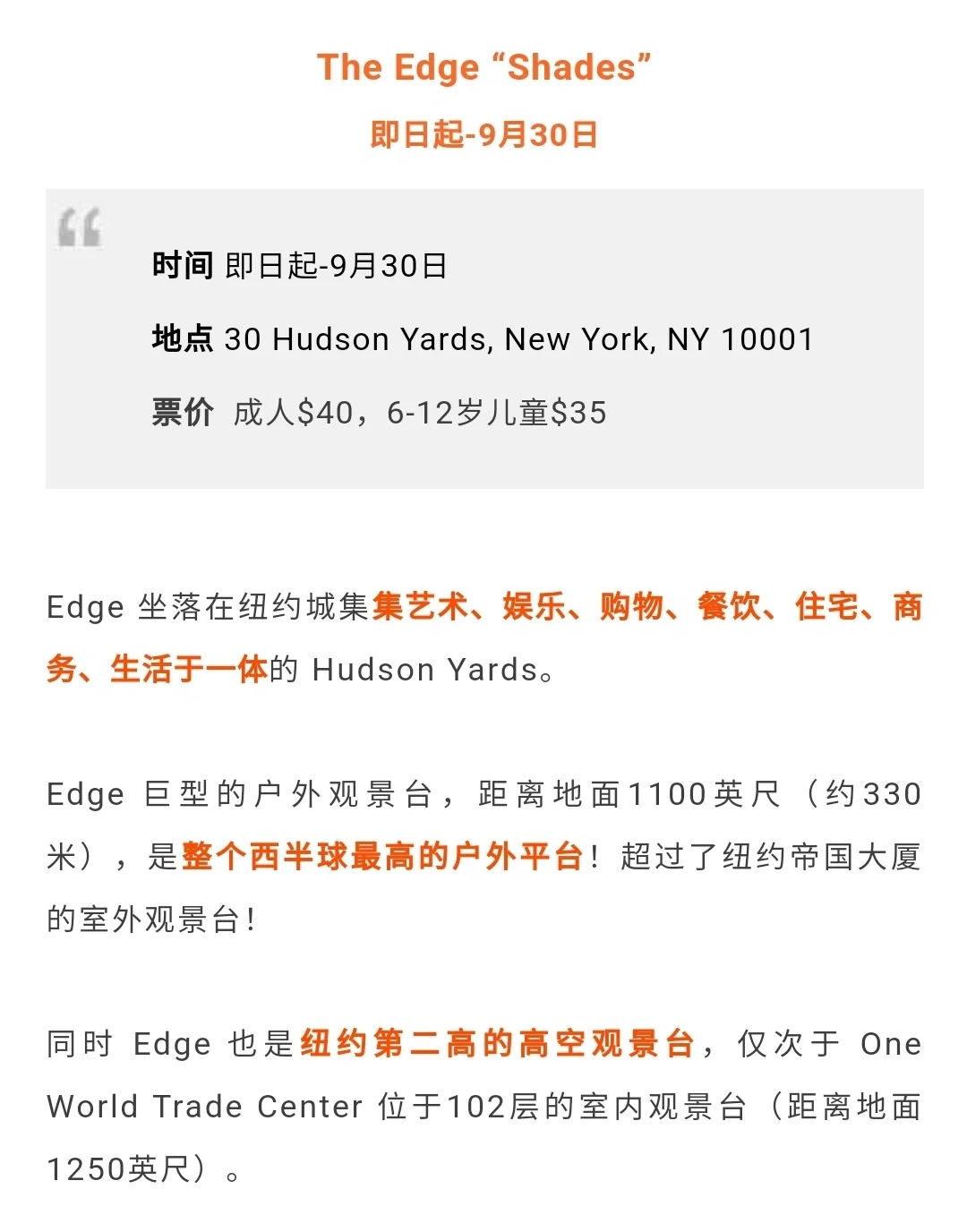 西半球zui高的户外天空观景台、也是纽约第二高的空中观景台,位于Hudson Yards 的 Edge 新推出了一个全新展览 “Shades”,将从7月下旬开展,并持续到9月底!🌈🌈🌈
