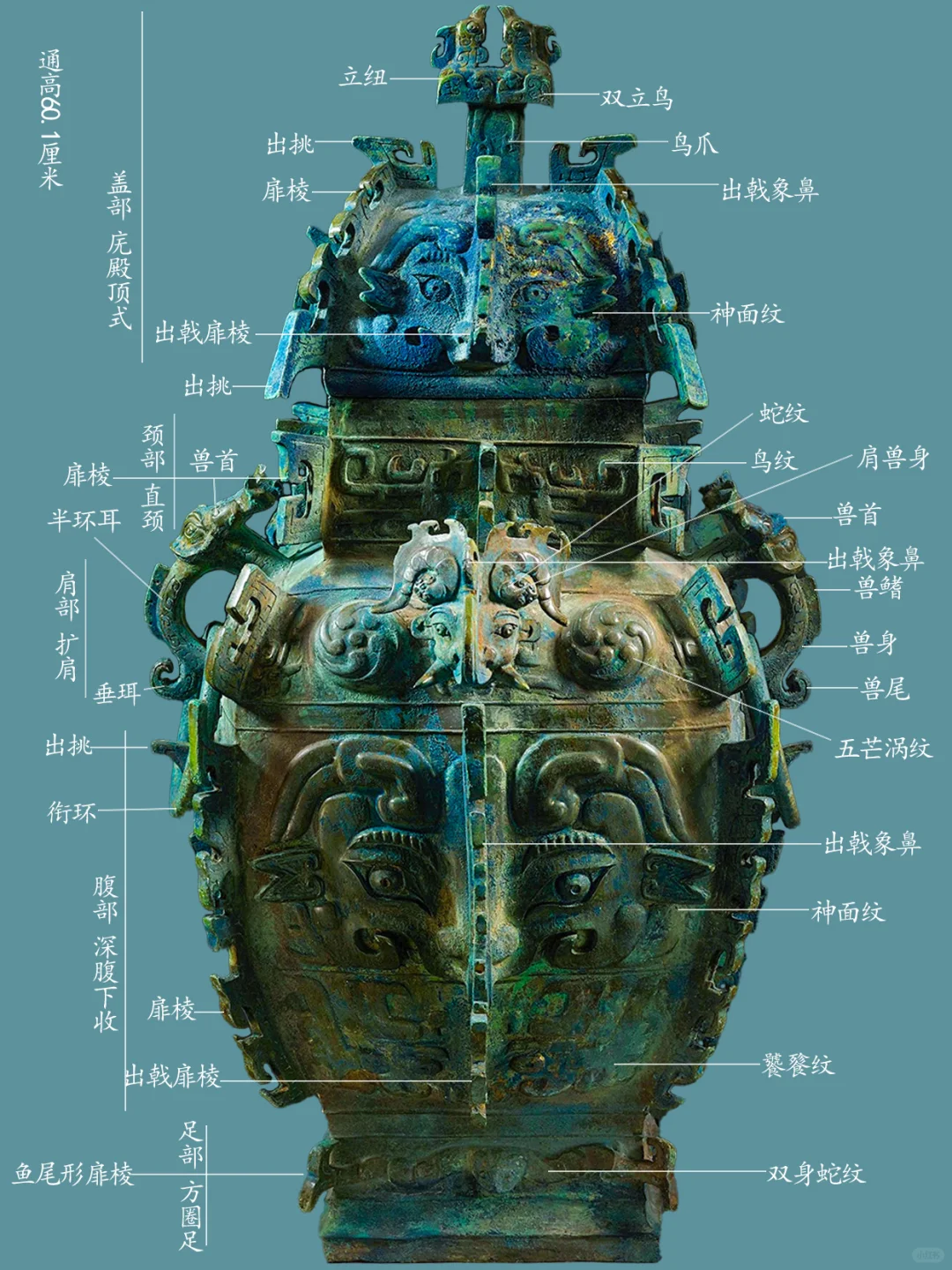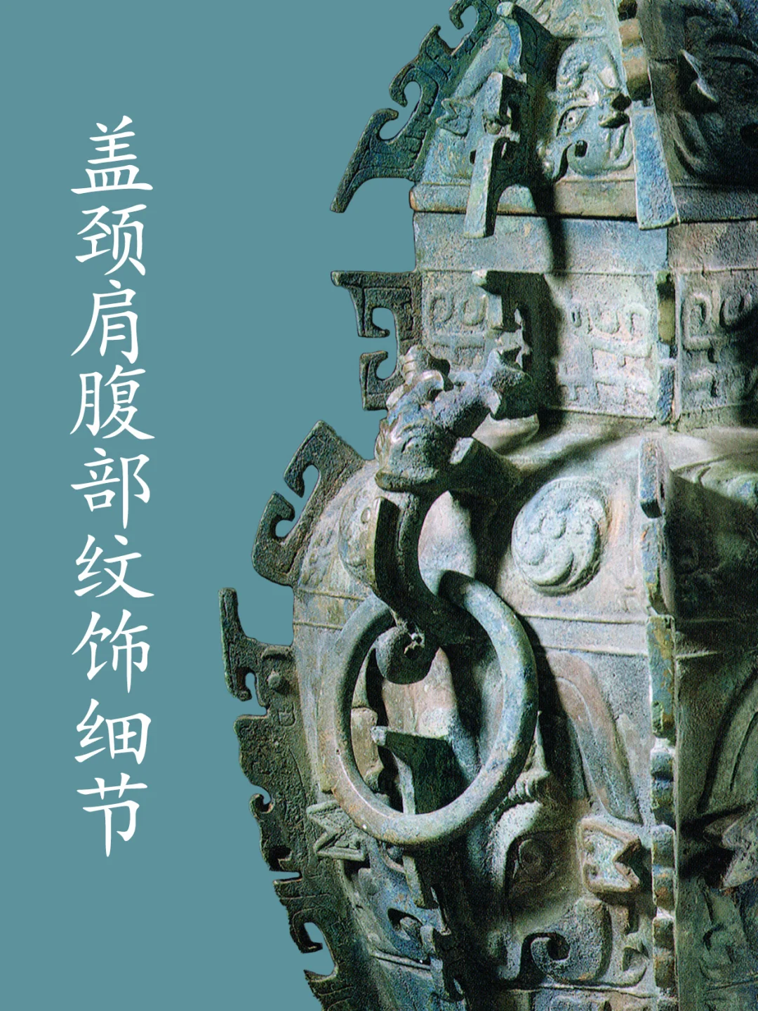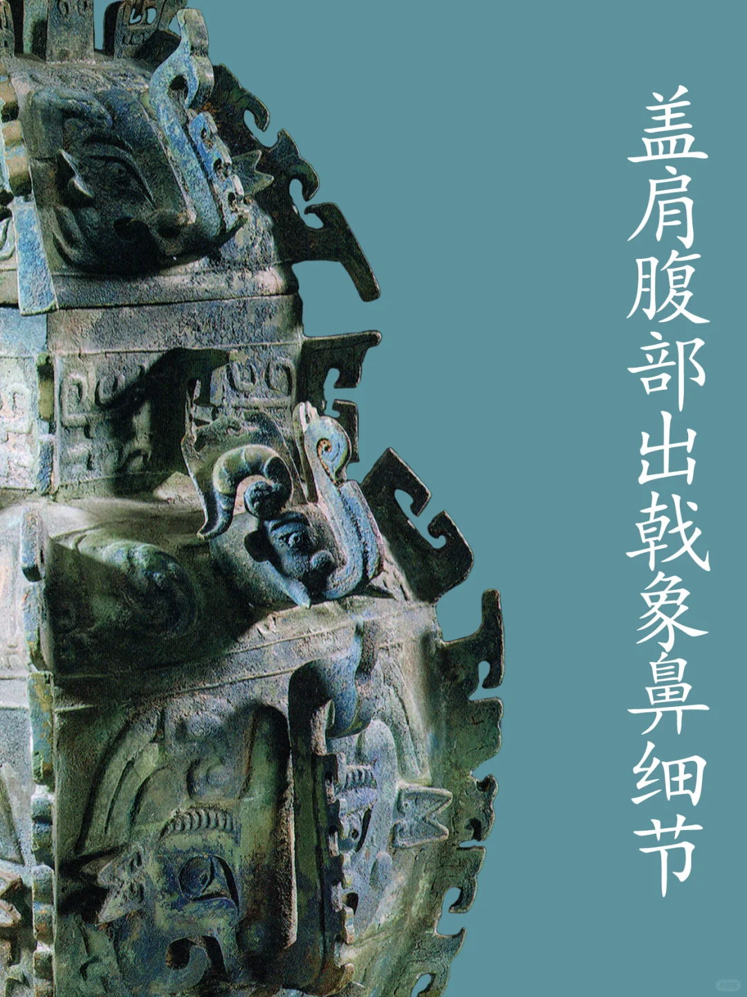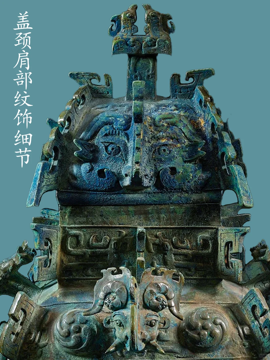 盖四面各饰一组神面纹,正背面神面较大,两侧较小,正背面神面纹以中部出戟扉棱为鼻,两侧神面纹中部以扉脊为鼻。肩部两侧正中各置一圆雕兽首半环耳,肩部前后正中各置一象鼻獠牙兽首,长颈横截面呈圆形,接在肩部前后面的正中,微微上斜,将兽首推出。兽首阔口宽脸,一对杏目斜吊并圆睁,眼珠中间的小圆凹窝示瞳仁;眼上眉骨凸起,长弯月形眉毛清晰,眼后侧张一对心形耳;耳面以阴线勾勒出耳蜗;额定耸起一对片状角,从中部对称的向侧面弯转下披;角根粗大,面饰勾云纹。勾形长角,角根部内平卷,角上延伸斜平折而下勾,角斜下饰半环形竖耳,旁饰双叶形圆雕横耳,角正下弯月形长眉,眉面粗阳线饰眉毛,下为一对杏目斜吊并圆睁,眼珠中间的小圆凹窝示瞳仁;下为凸隆圆起示兽鼻头,张口浮雕獠牙,口出一圆雕近长尖状齿;旁出卷云纹、勾连纹示兽身、兽爪。腹上部四面各饰一组高浮雕神面纹,每组以中部扉棱为界,正背面神面象鼻为出戟扉棱饰,腹下部四面各饰一组标准饕餮纹,圈足四面各饰一双身龙首纹,正面合体为一龙首,龙长身作拱状,尾部开叉作扉棱。