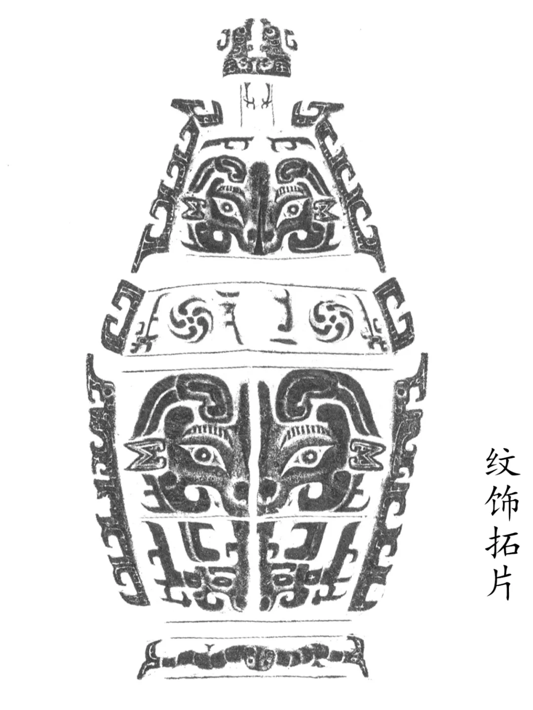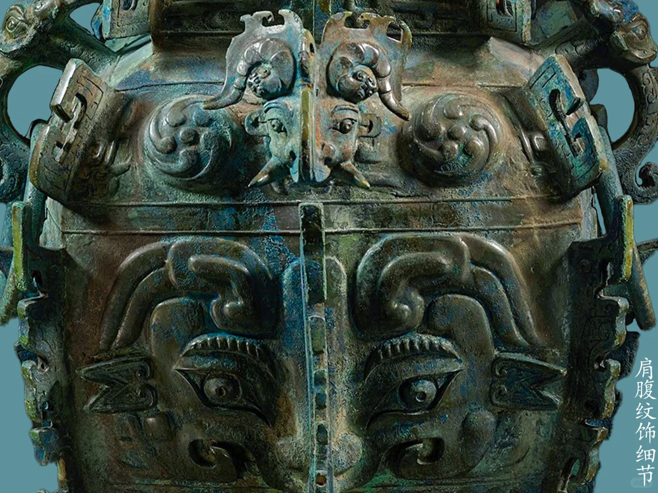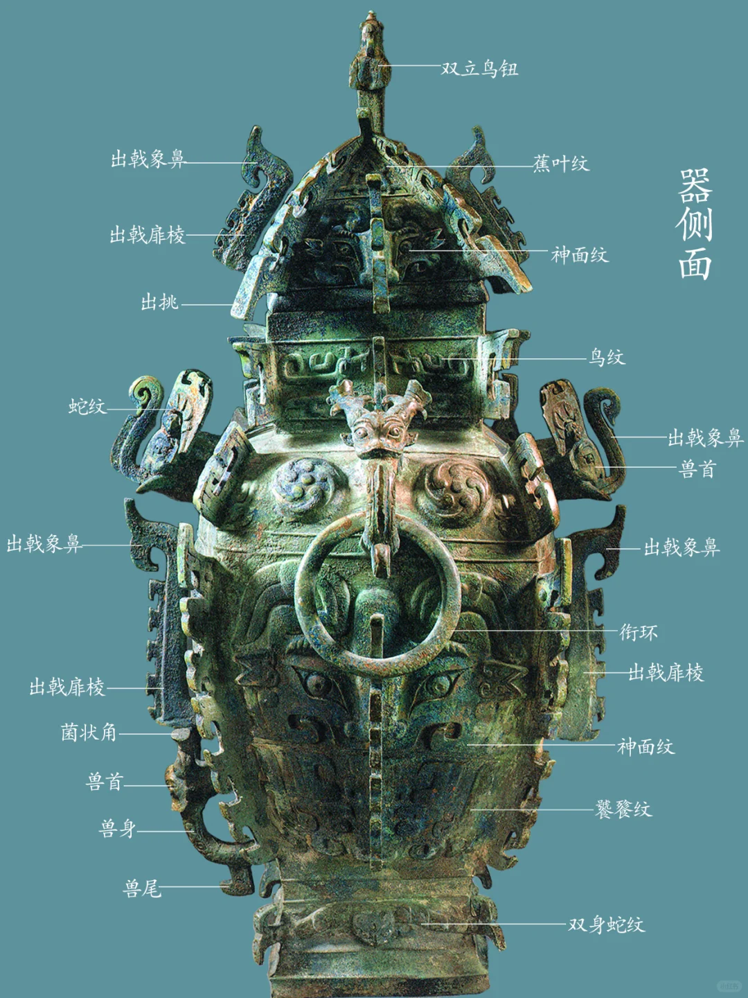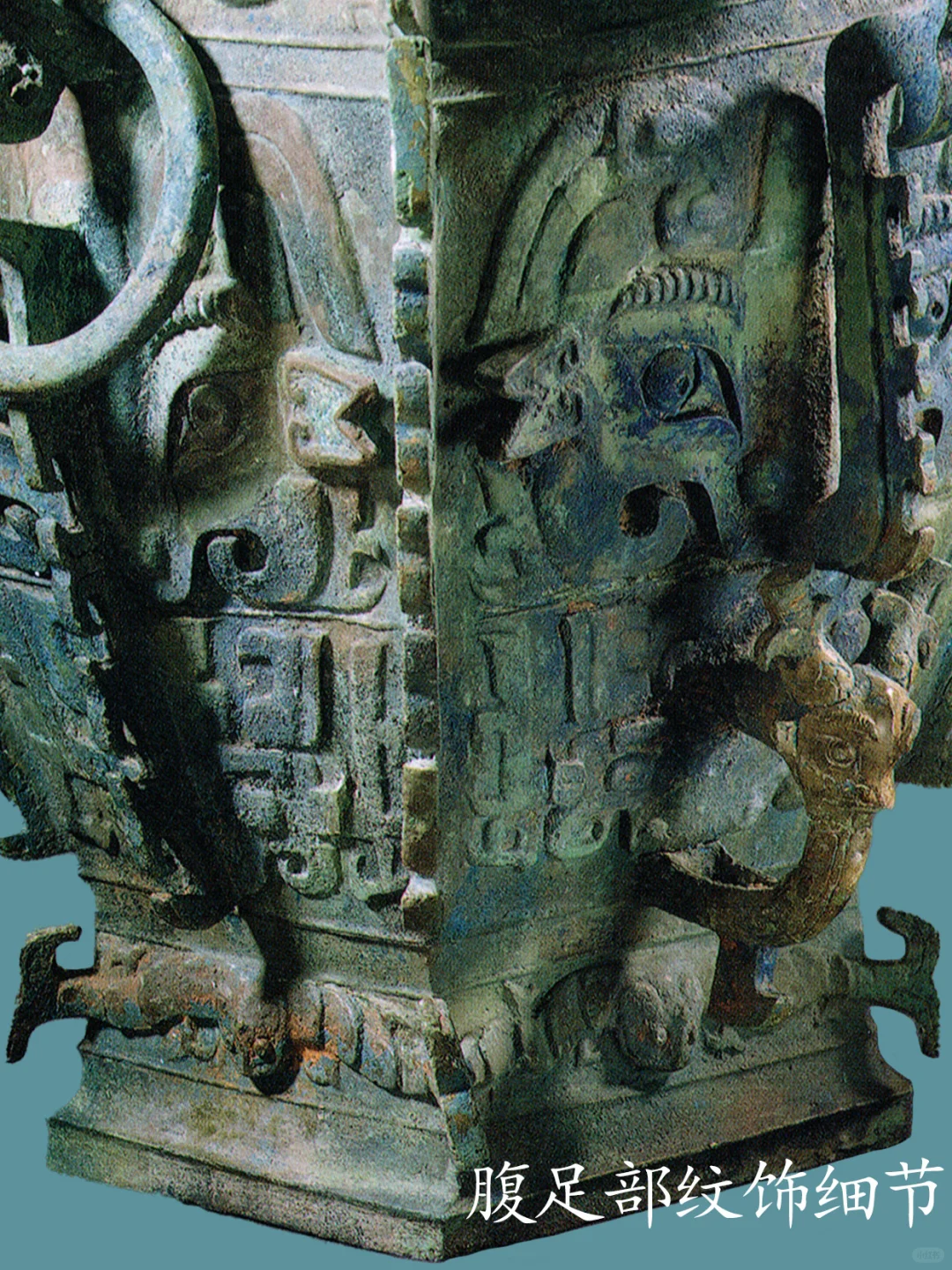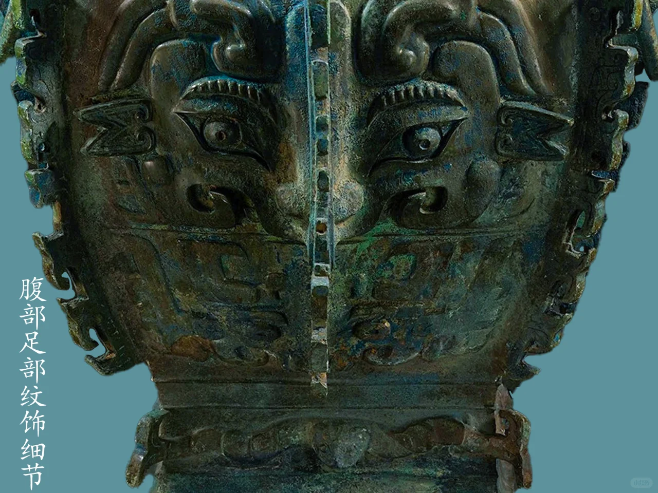 盖四面各饰一组神面纹,正背面神面较大,两侧较小,正背面神面纹以中部出戟扉棱为鼻,两侧神面纹中部以扉脊为鼻。肩部两侧正中各置一圆雕兽首半环耳,肩部前后正中各置一象鼻獠牙兽首,长颈横截面呈圆形,接在肩部前后面的正中,微微上斜,将兽首推出。兽首阔口宽脸,一对杏目斜吊并圆睁,眼珠中间的小圆凹窝示瞳仁;眼上眉骨凸起,长弯月形眉毛清晰,眼后侧张一对心形耳;耳面以阴线勾勒出耳蜗;额定耸起一对片状角,从中部对称的向侧面弯转下披;角根粗大,面饰勾云纹。勾形长角,角根部内平卷,角上延伸斜平折而下勾,角斜下饰半环形竖耳,旁饰双叶形圆雕横耳,角正下弯月形长眉,眉面粗阳线饰眉毛,下为一对杏目斜吊并圆睁,眼珠中间的小圆凹窝示瞳仁;下为凸隆圆起示兽鼻头,张口浮雕獠牙,口出一圆雕近长尖状齿;旁出卷云纹、勾连纹示兽身、兽爪。腹上部四面各饰一组高浮雕神面纹,每组以中部扉棱为界,正背面神面象鼻为出戟扉棱饰,腹下部四面各饰一组标准饕餮纹,圈足四面各饰一双身龙首纹,正面合体为一龙首,龙长身作拱状,尾部开叉作扉棱。