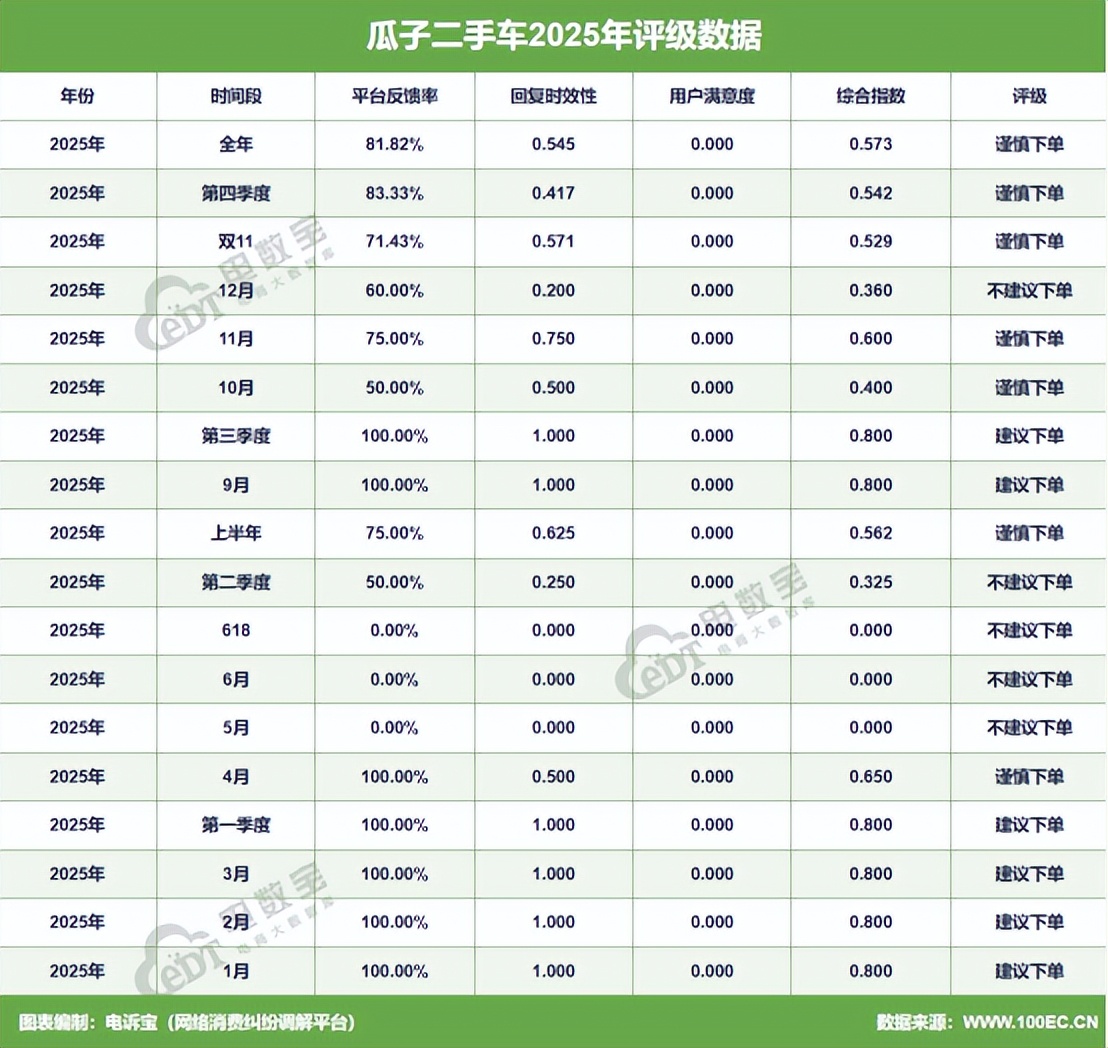 据网经社旗下电商大数据库“电数宝”监测数据显示,2025年“瓜子二手车”共获得18次消费评级,其中6次“建议下单”,7次“谨慎下单”,5次“不建议下单”,2025年整体消费评级为“谨慎下单”。
