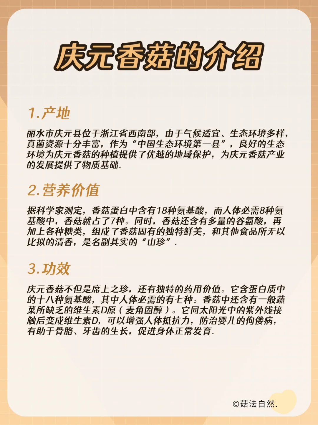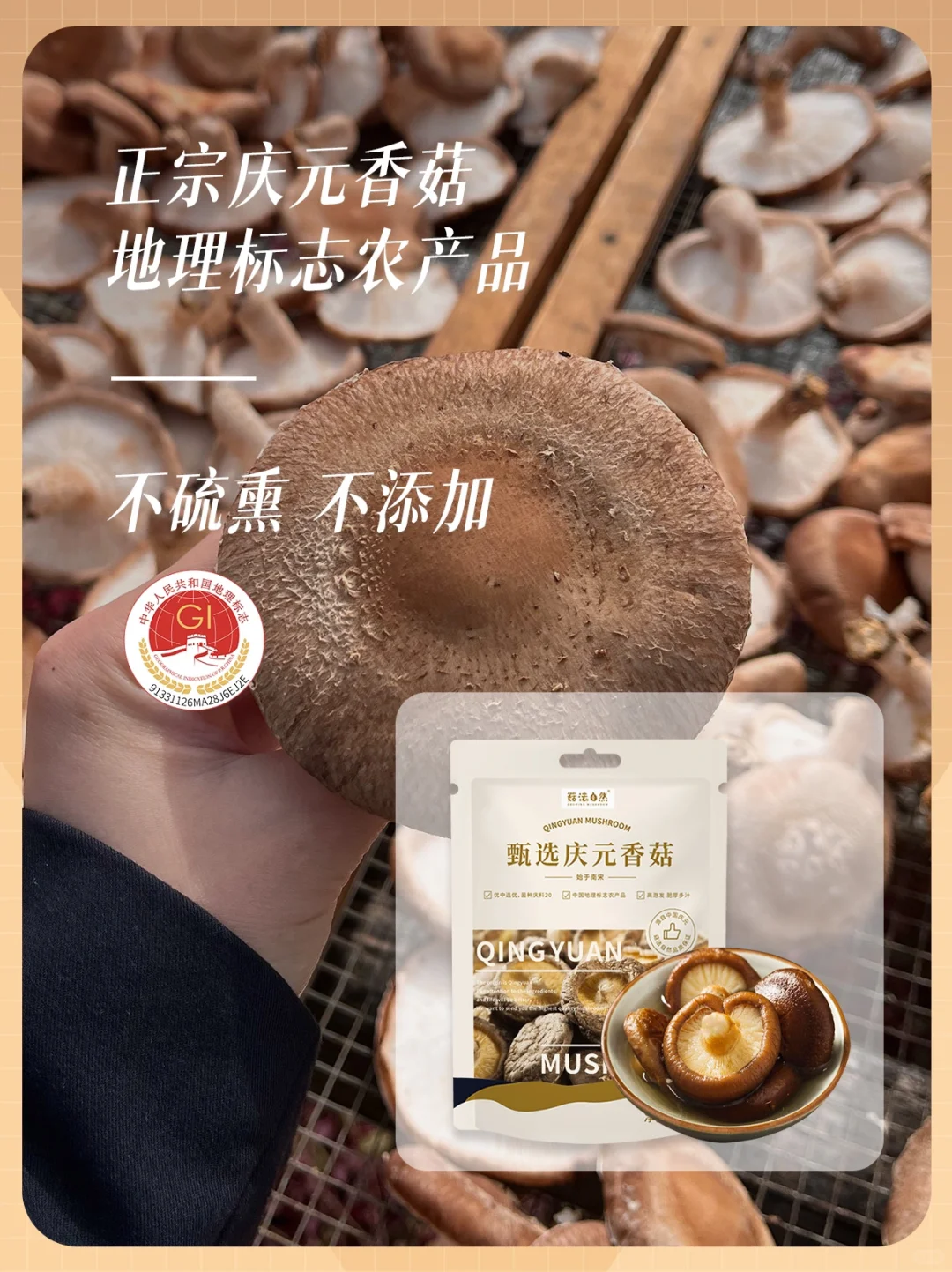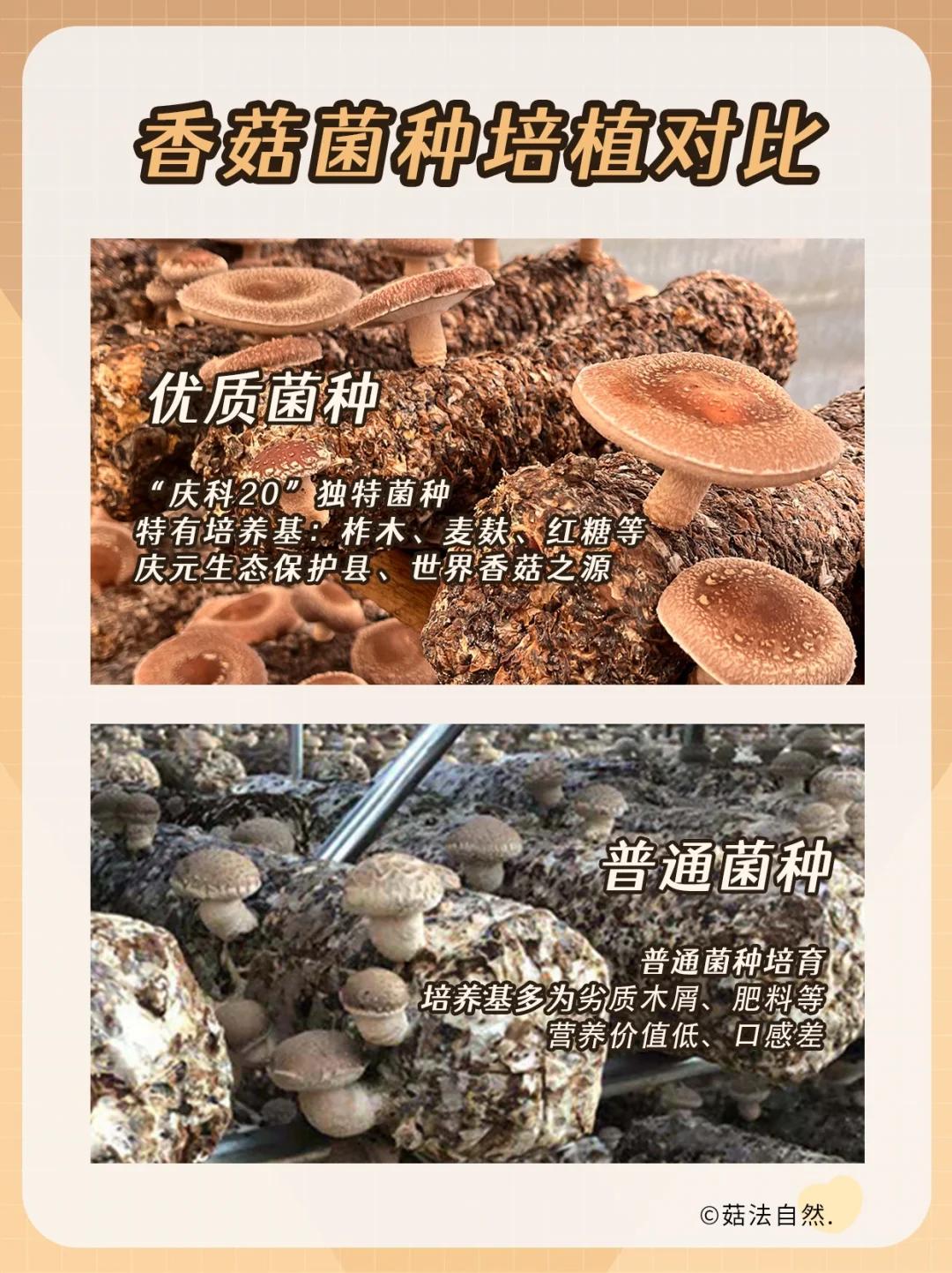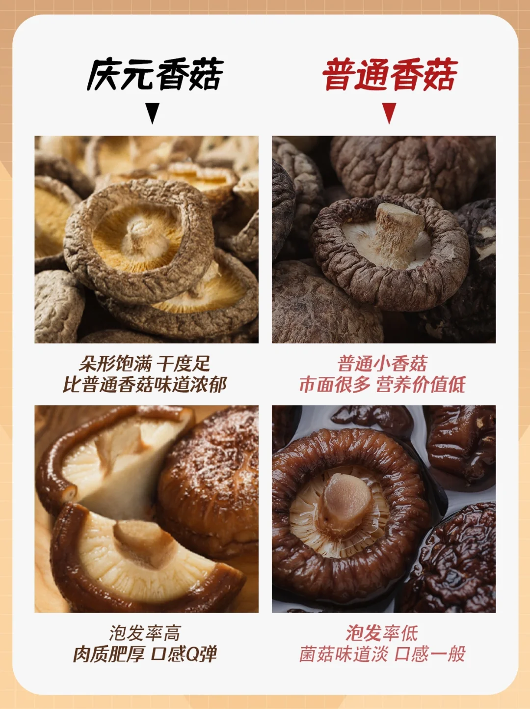 🔍 香菇是一种营养非常丰富的食物,香菇中含有丰富的维生素,可以很好的促进身体生长发育~ 香菇中富含营养最高的的就是庆元香菇,含有18种氨基酸和维生素D,想要买正宗的庆元香菇看这四种方法~ ✅看外形:大小均匀 圆润饱满干度足 ✅闻气味:干香菇菌香浓郁有股海鲜的味道 ✅看颜色:菇面棕褐色,内面呈奶黄色 ✅看泡发:泡发率高,肉质肥厚紧实 🔔 推荐【菇法自然】的正宗庆元香菇,色香味浓,坚持原产地种植,严格源头把控品质。人工采摘、圆润饱满、肉质厚实、泡发度高~
