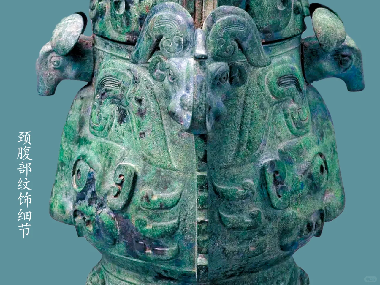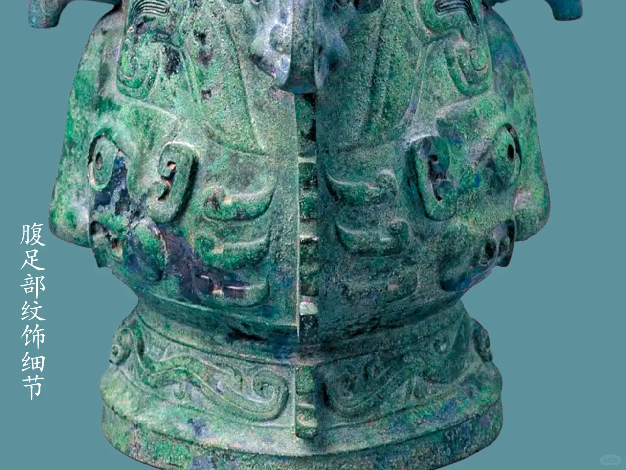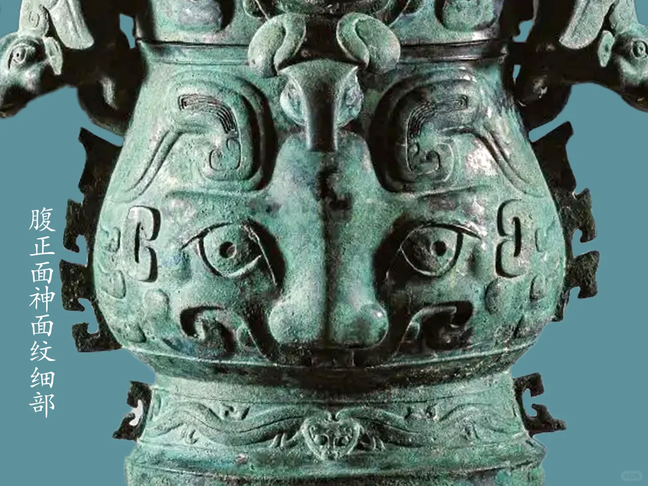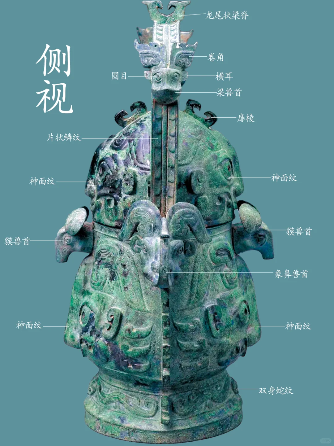 提梁面饰浮雕片状鳞纹, 盖顶站立一圆雕枭(猫头鹰)钮 ,盖面饰二组神面纹,以侧面中部戟角为界,腹部正背面各饰饰一组高浮雕神面纹,前后各一组,每组以腹中部鼻为扉棱。勾形长角,角根部内平卷,角上延伸斜平折而下勾,角斜下饰半环形竖耳,旁饰双叶形圆雕横耳,角正下弯月形长眉,眉面粗阳线饰眉毛,下为一对杏目斜吊并圆睁,眼珠中间的小圆凹窝示瞳仁;下为凸隆圆起示兽鼻头,张口浮雕獠牙,口出一浅浮雕近长方勾形示兽齿;旁出卷云纹、勾连纹示兽身、兽爪。圈足部饰两组高浮雕双身蛇首纹,前后各一组,每组以侧面扉棱为界,蛇长身作拱状,尾部回卷。