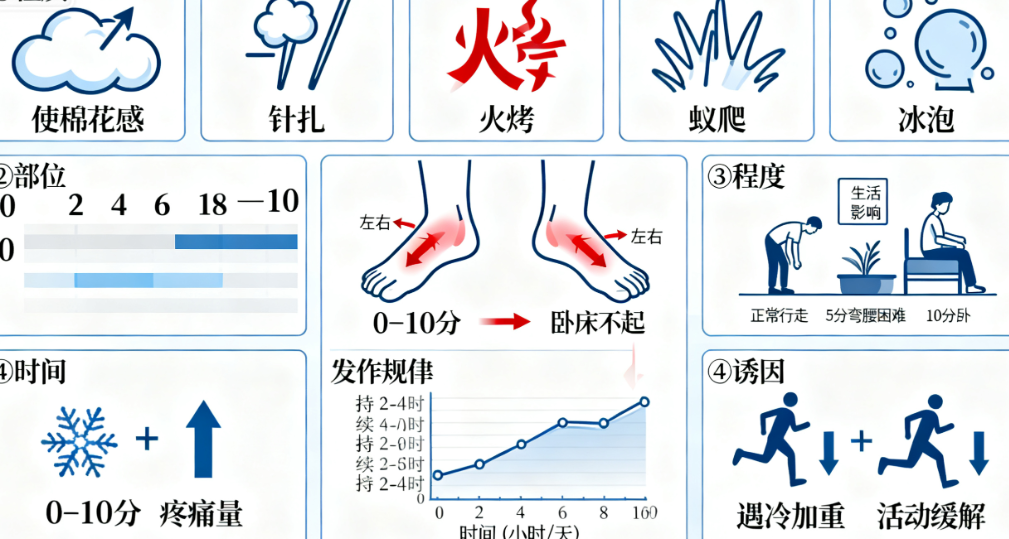 疼痛类症状:性质(刺痛/钝痛/烧灼痛)、发作频率和规律、对睡眠/情绪的影响(示例:“脚底像火在烧,晚上躺下后疼得睡不着,三个月来越来越频繁”)。