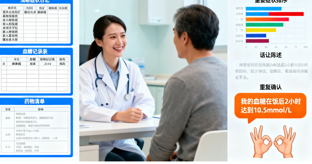 确认理解一致:医生给建议后,重复一遍自己的理解(如“您是说先…,如果…再来复诊?”)。