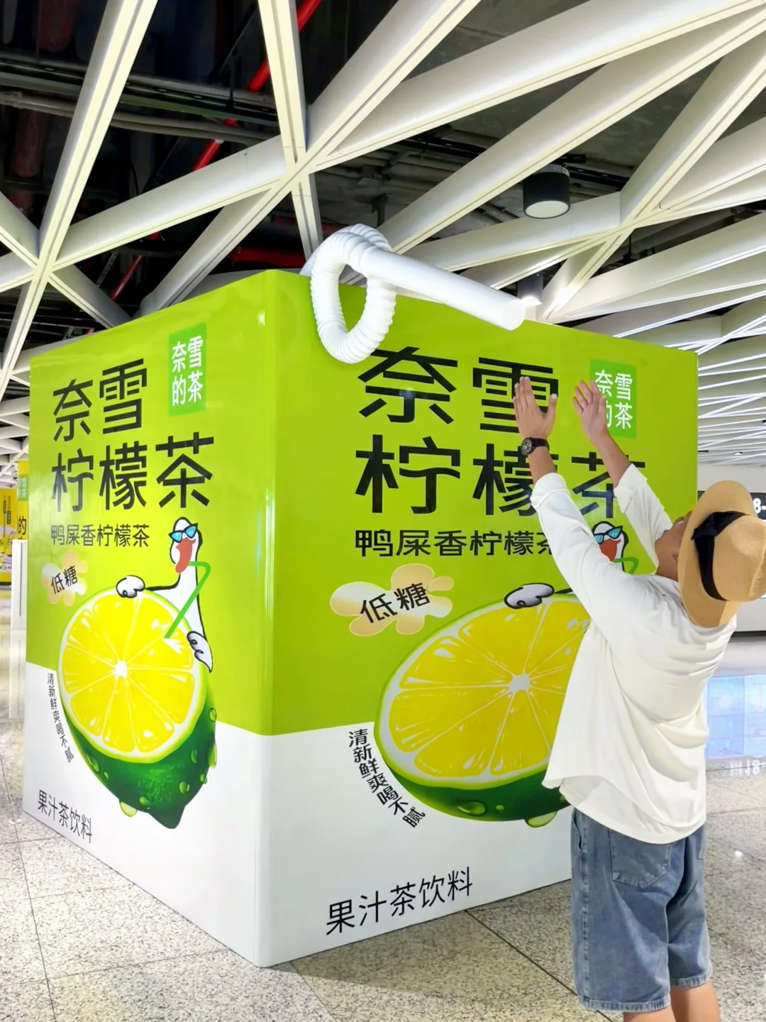 地铁站科技感十足,有种穿越到未来的视觉冲击力。转线时遇到了奈雪鸭屎香柠檬茶的创意装置,爽言爽语,爽到变形的包装,一下就被击中了我这不安分的心巴,不得不说奈雪真的太懂年轻人了
