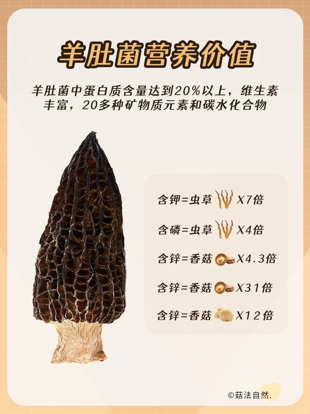 🔔 羊肚菌中蛋白质含量达到20%以上,维生素丰富,20多种矿物质元素和碳水化合物~ ✅ 选择个头大、朵型完整的,颜色呈棕褐色,泡发后菌壁肥厚,菌香浓郁、口感细腻~ ❌不选择个头小、菌壁偏薄的,表面无光泽 肉质柴、有杂质 挑选小菇,价格低、营养低~