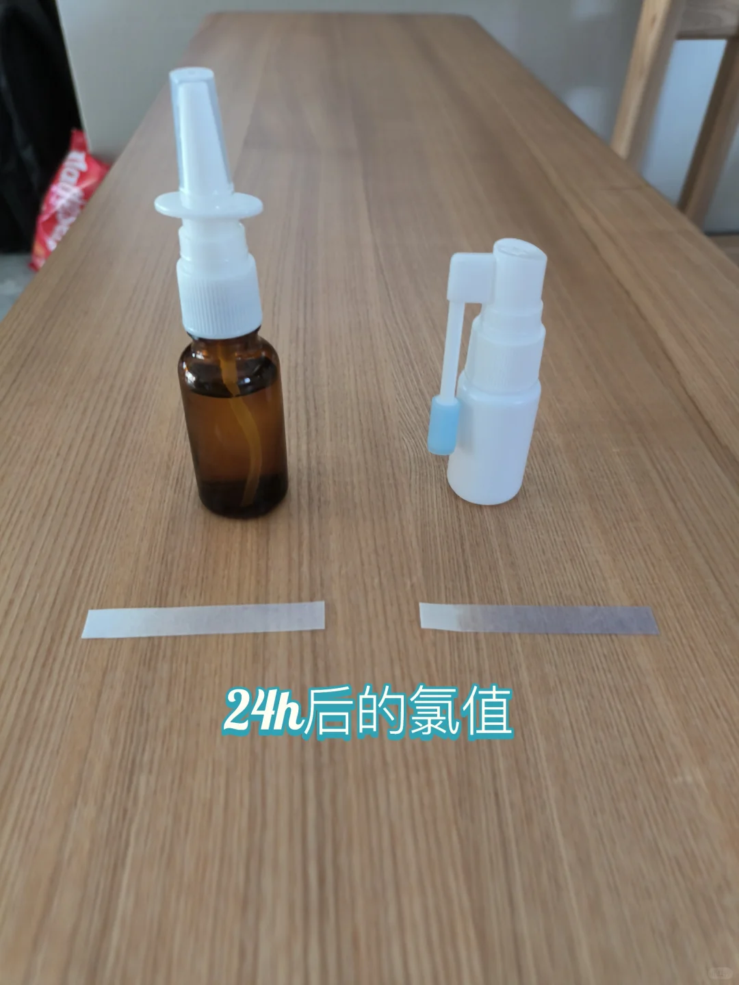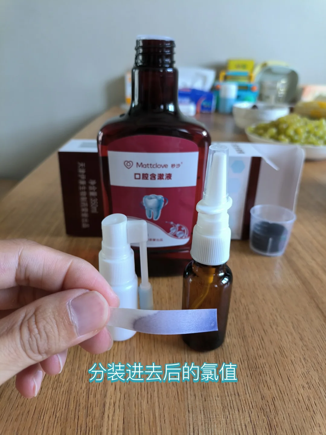 测试组:享洁,秒沙未开封的红瓶漱口水。生产厂家都是一个。 [一R]享洁7月份,秒沙4月份。第一天拆封,用测氯试纸测试,4月份的秒沙氯值有衰减,估计在50-75。7月的享洁氯值在100左右。 [二R]PE塑料瓶和茶色玻璃瓶分装秒沙的漱口水。室内暗格内半避光保存。24h后发现都会衰减。塑料瓶衰减的少一点,但是氯值只有25左右了。茶色玻璃瓶基本没有氯了。虽然还有氯味,不能以气味来判断。 [三R]所以,目前分装建议PE塑料瓶,24h以内换一次比较安全。