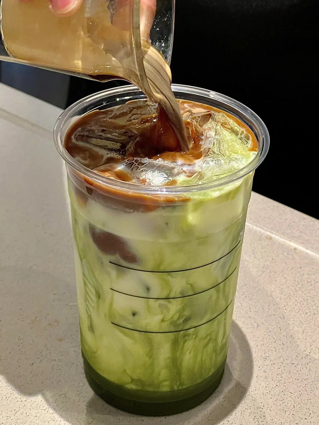 咖啡脑袋闭眼入这杯!浓郁咖啡➕清新抹茶➕Q弹抹茶冻搭配山系风情牛乳一口下去,班味都少了一大半!!