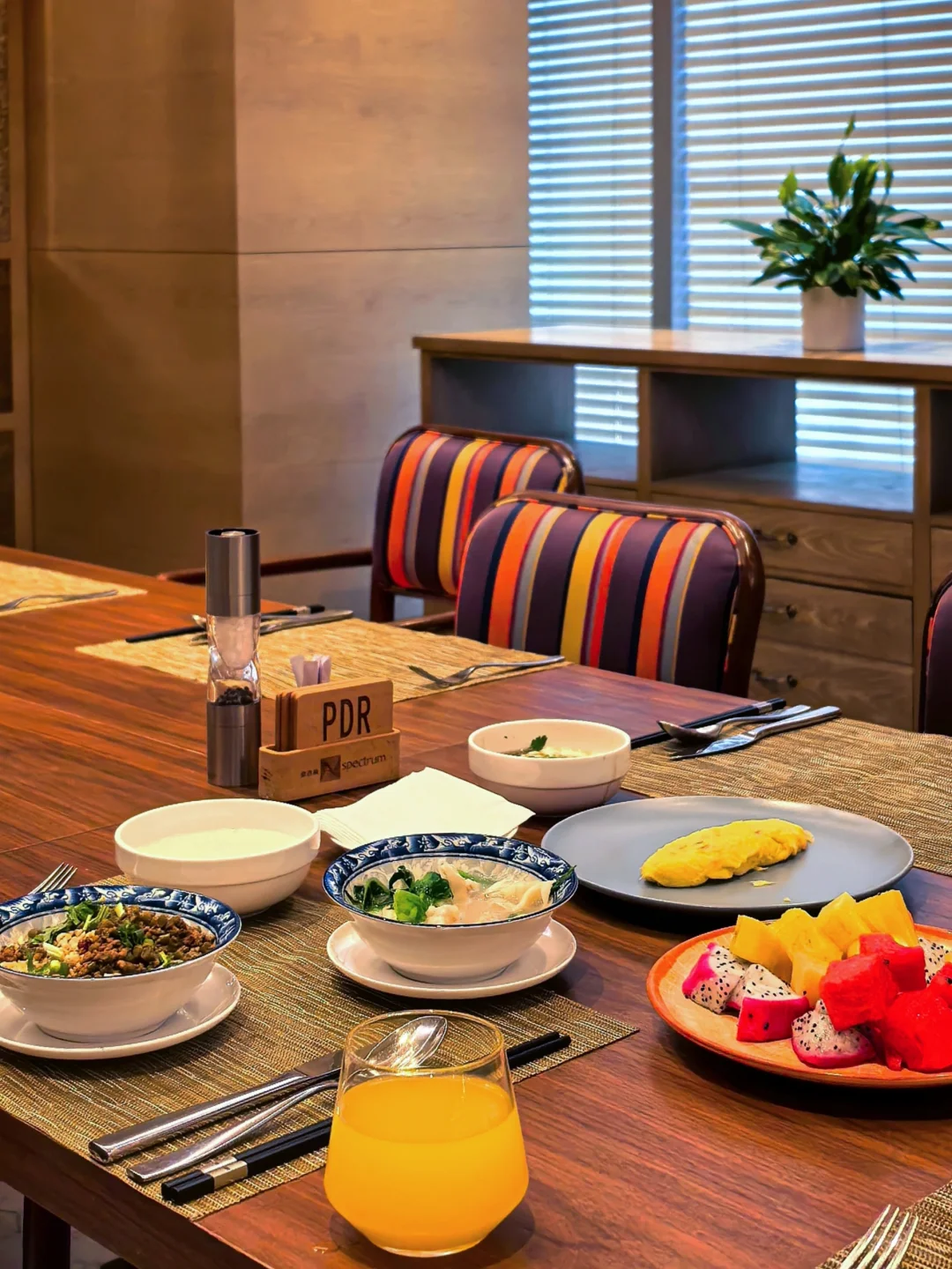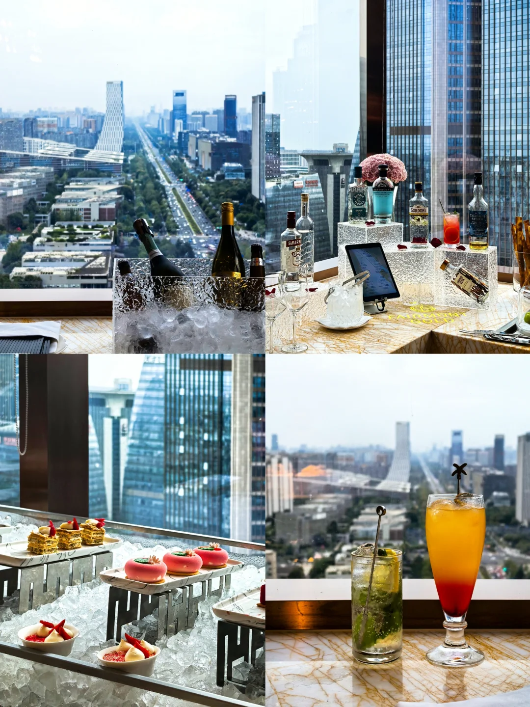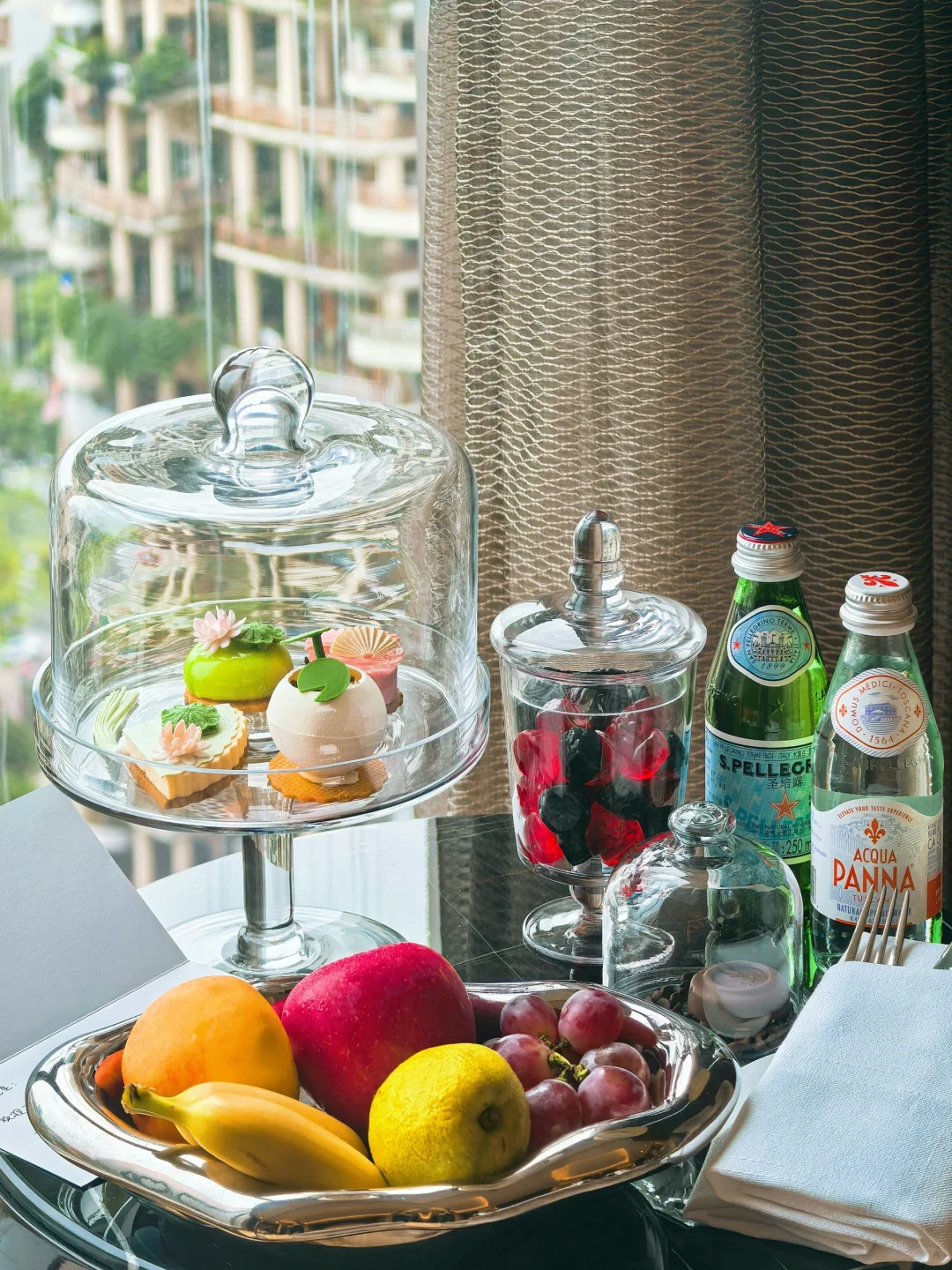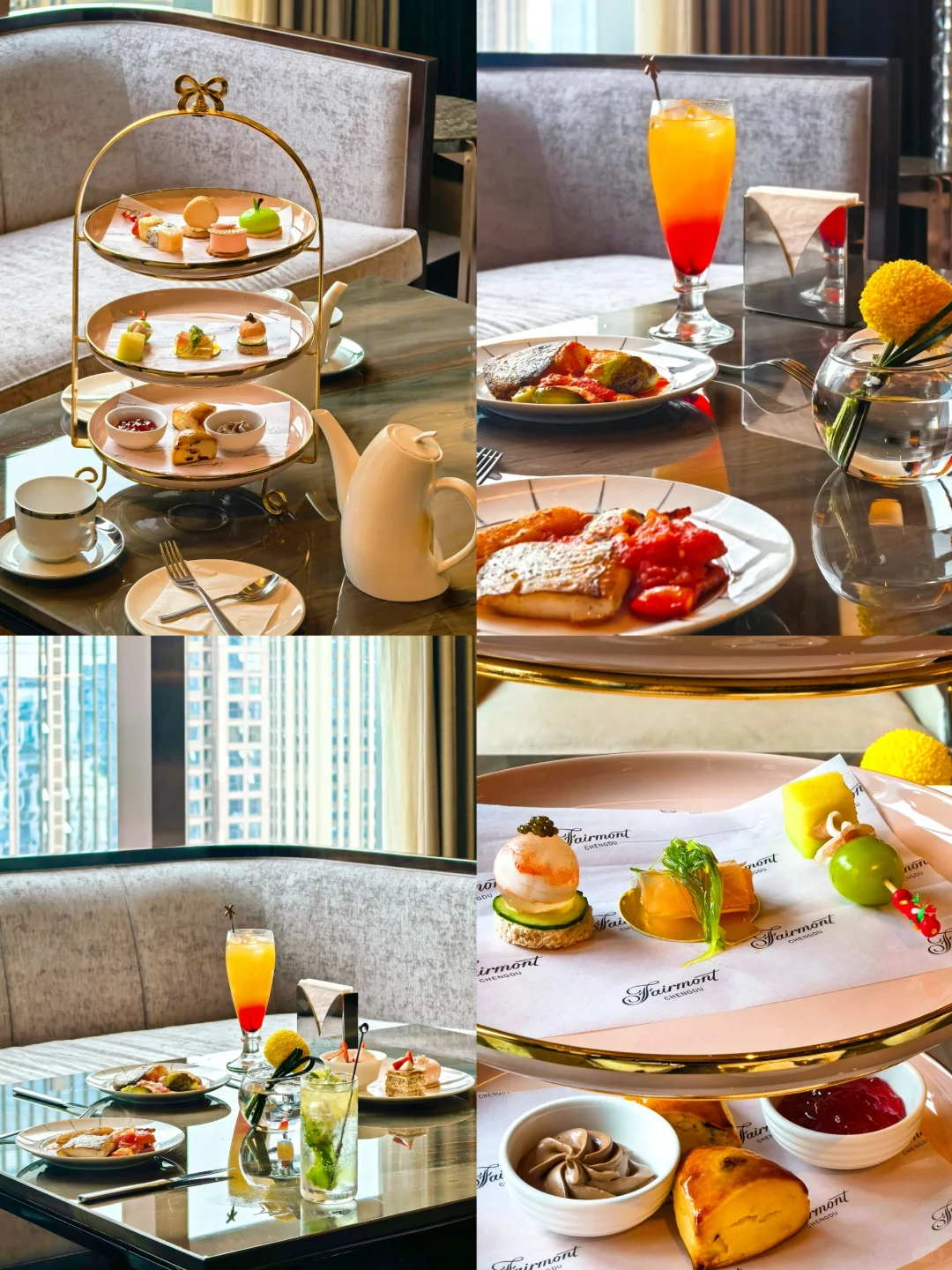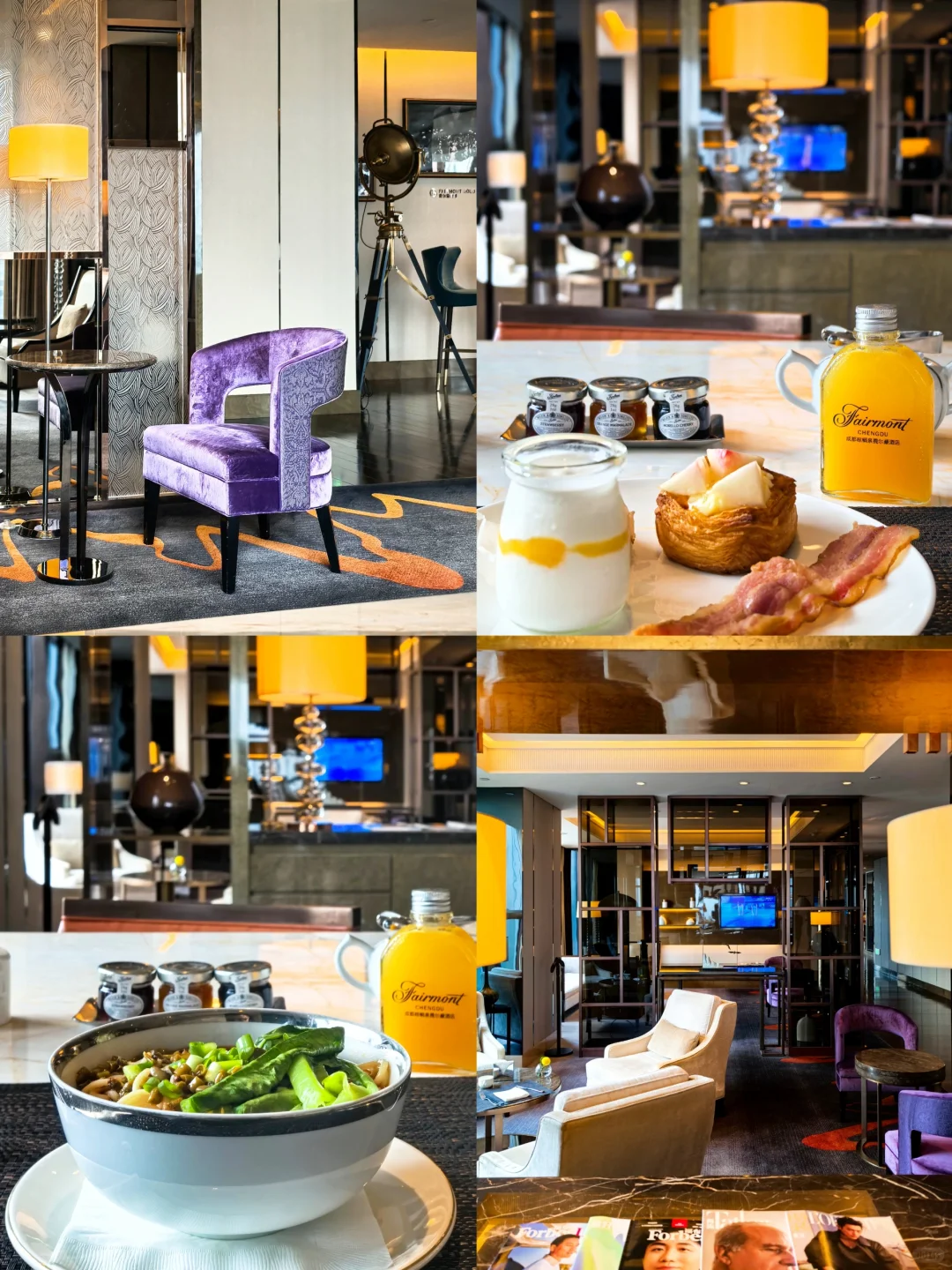 正如我之前提到的,费尔蒙的精髓就在于金尊酒廊。酒廊位于31楼,并且在29到31层的金尊楼层做了一个非常有中式奢华感的连接楼梯。流浪装修充满着北美奢华并对金尊酒廊的历史做了很好的展陈,紫色和白色的配色非常高级,270度的全景玻璃将天府大道开阔的中轴线完全呈现在眼前,视野非常震撼!酒廊包含欧陆式早餐、高空下午茶、晚间鸡尾酒小食。早餐有手工面条和不少和一楼早餐对比下来完全不虚并且更加安静私密。下午茶是成套的,用到了西班牙火腿和三文鱼出品很不错。欢乐时光除了特调的鸡尾酒(可以做无酒精)、热菜、甜点和水果拼盘,还有现做的位上菜,我那天是煎鱼,出品很不错。