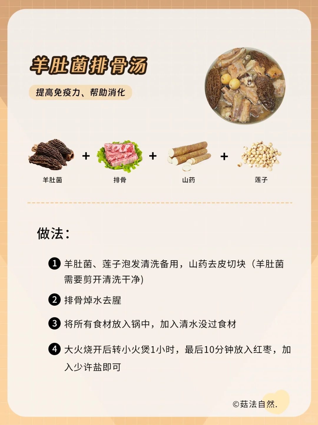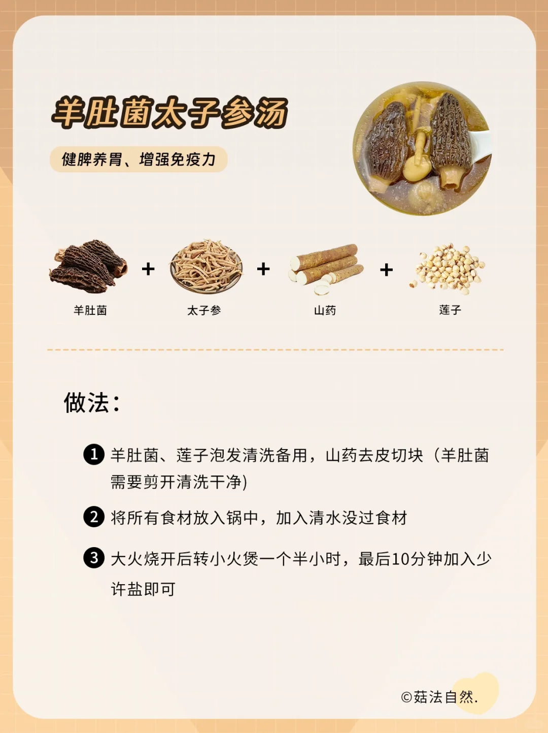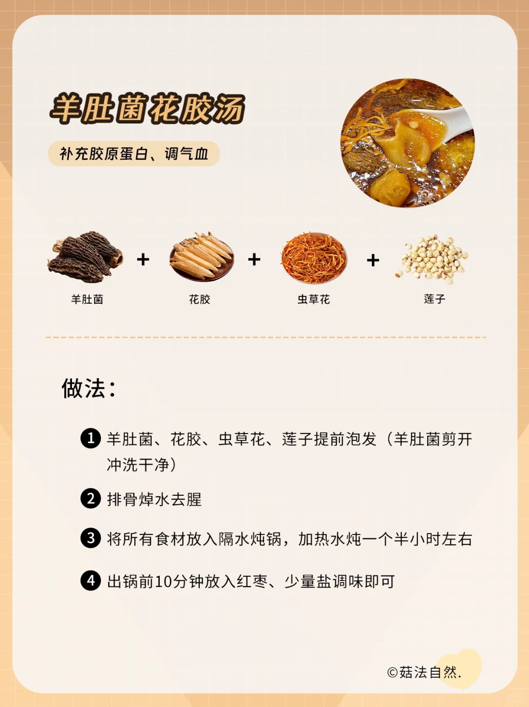 🍃羊肚菌被称为“菌中之王”含有丰富的维生素、氨基酸、矿物质等营养成分,具有健脾养胃,补肾益肺,提高免疫力的功效! ✨四季养生,喝汤滋养,脾胃好,气色好,身体好!分享几款滋补益气,温和健脾,鲜甜好喝的汤料搭配~ ✅1.羊肚菌石斛乌鸡汤 ✅2.羊肚菌花胶汤 ✅3.羊肚菌排骨汤 ✅4.羊肚菌太子参汤 🔔以上汤料搭配排骨/瘦肉/乌鸡/土鸡炖汤/煲汤,汤水清润滋养,营养好喝不油腻!