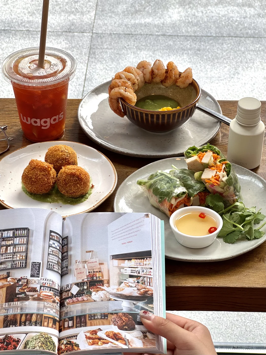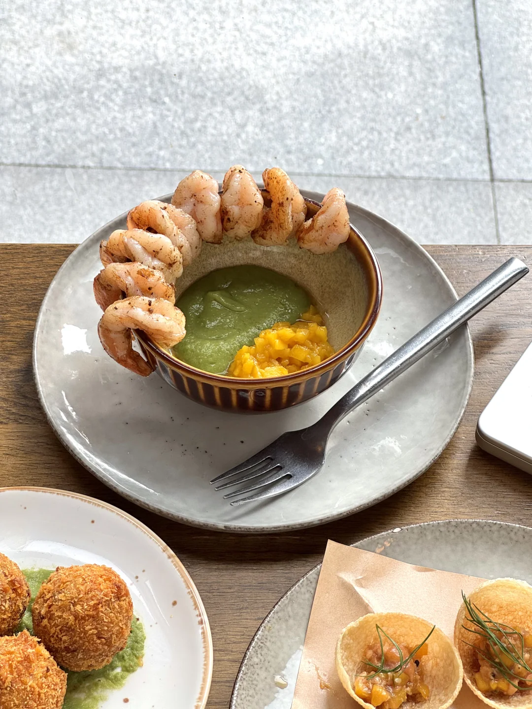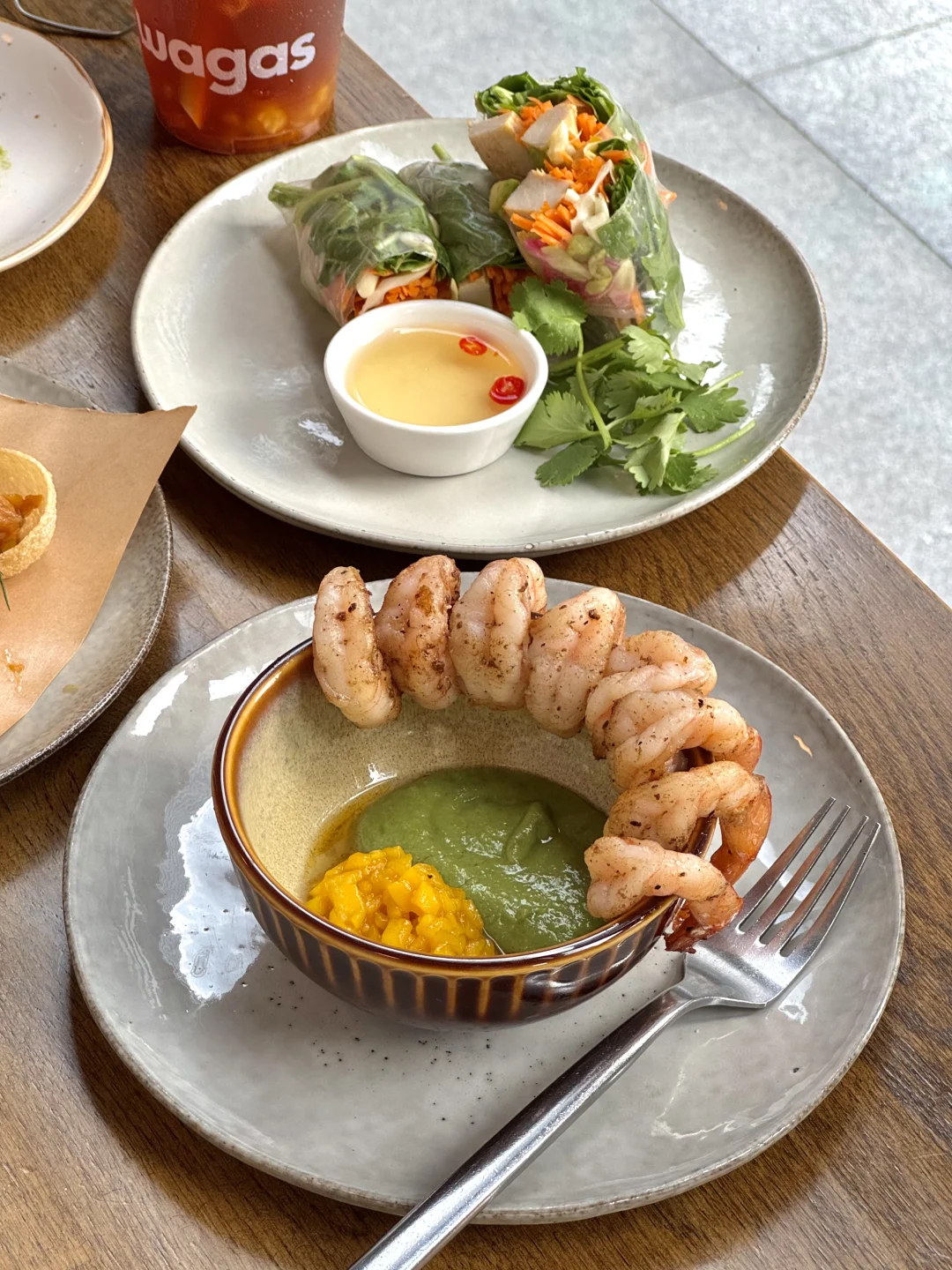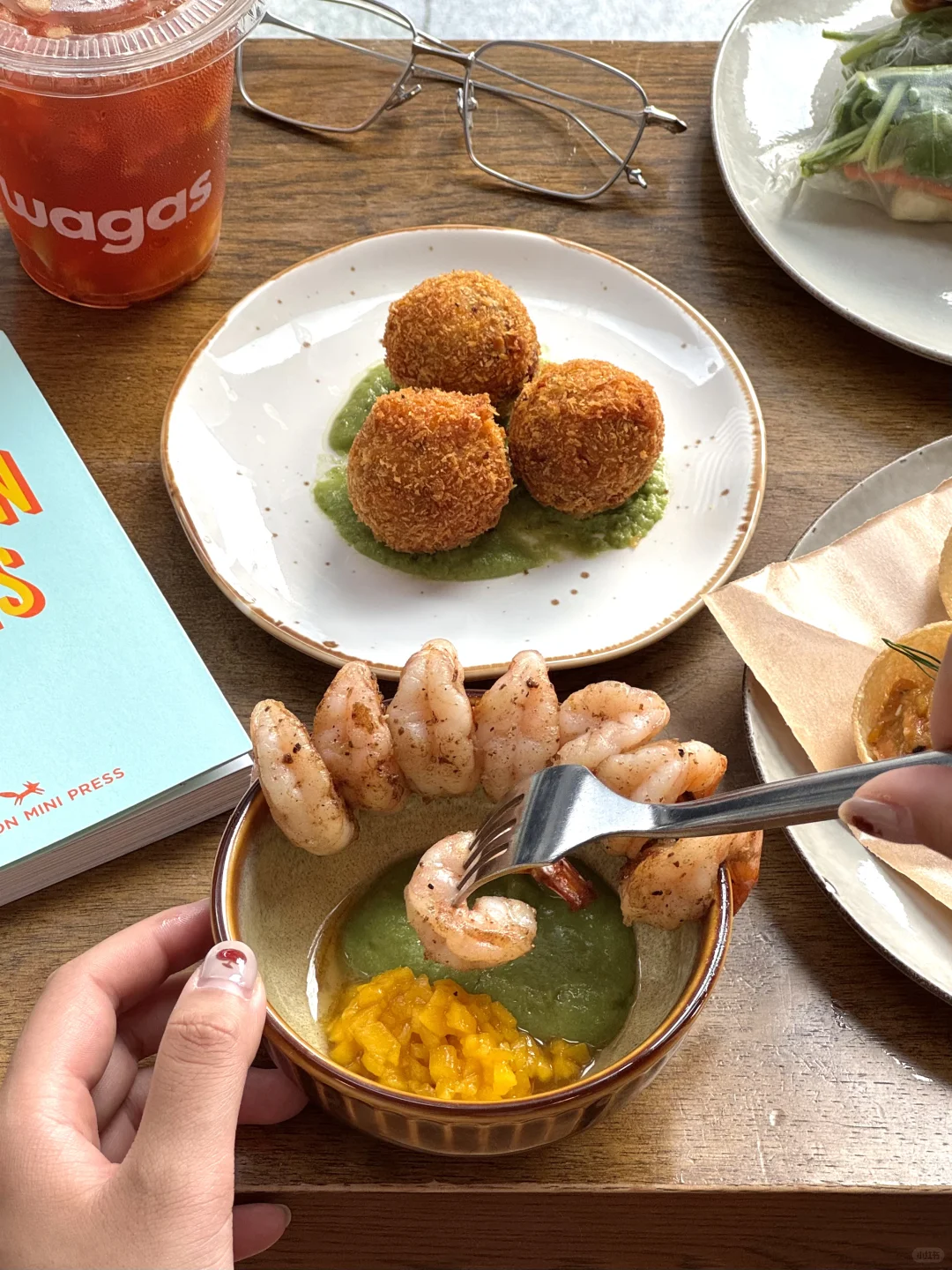 🦐虾仁芒果配青辣椒酱:开背现煎得大虾新鲜Q弹!东南亚风味的蘸酱更是好吃!!牛油果🥑搭配青辣椒🫑再来一些甜软的芒果果肉!口感和层次都相当丰富!!蛋白质、维生素整个补充到位!