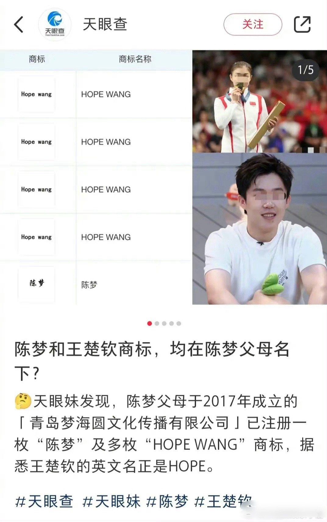 据了解,陈梦、王楚钦商标都在陈梦的父母名下,陈梦于2017年成立的青岛梦海圆文化传播有限公司已注册一枚“陈梦”及多枚 “HOPE WANG”商标,而王楚钦的英文名正是 HOPE,你怎么看?