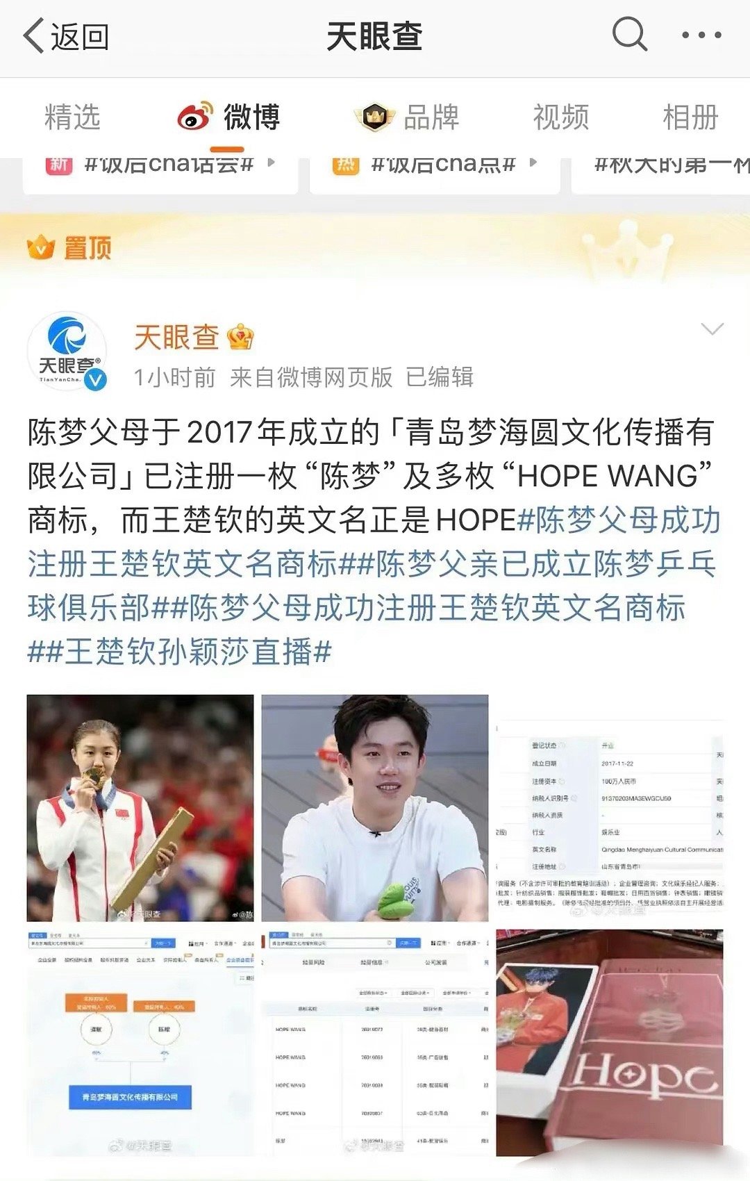天眼查发了陈梦、王楚钦相关,并且把微博置顶了,这是在拆莎头cp吗?