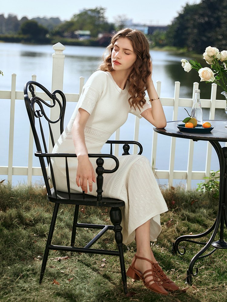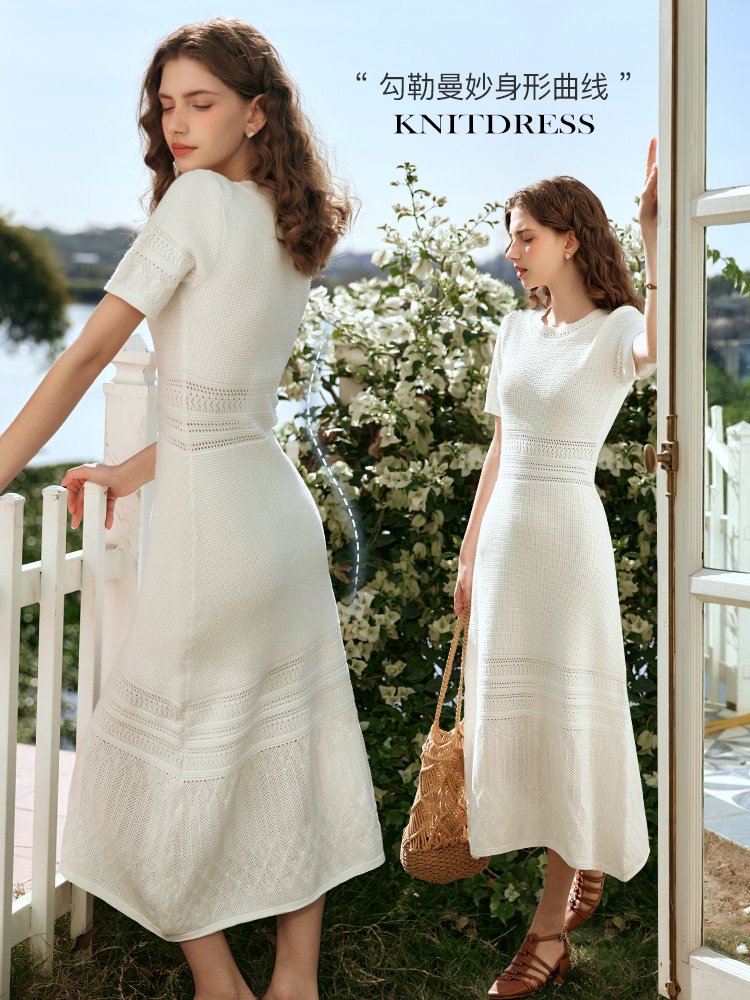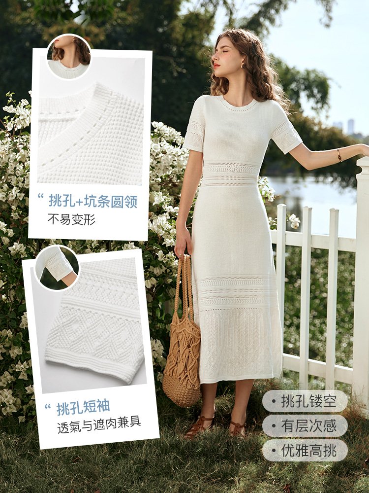 佰搭圆领设计,领口挑孔+坑条收边,不易变形,高收腰X型,优化身材比例,显气质显高挑,腰部和下摆别致的镂空设计,精美有层次,配合自然A摆,行走间流露灵动美感,优雅不拖沓