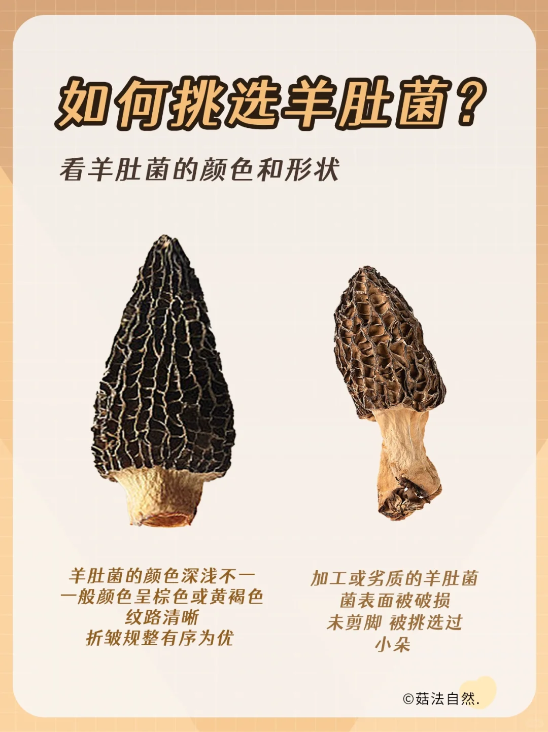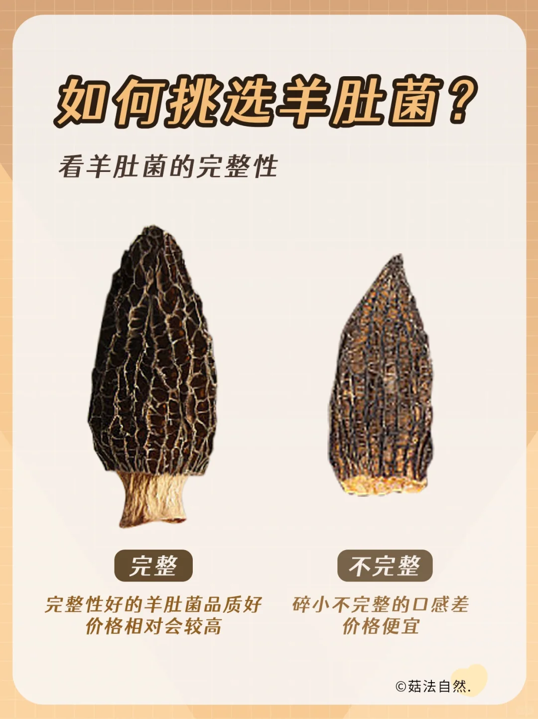 ✅1.看个头: 挑选羊肚菌一般以个大、色深、尖顶、头茬为优,肉质厚实 营养价值高. ✅2.完整性: 完整性好的羊肚菌品质好,价格相对较高,完整性不好的菌菇可能是被挑选过的次品. ✅3.看颜色: 羊肚菌的颜色深浅不一,颜色呈棕色或黄褐色,纹路清晰,褶皱规整有序为优. ✅4.看肉质: 优质的羊肚菌泡发后菌壁厚实饱满,薄的羊肚菌口感柴,营养低.