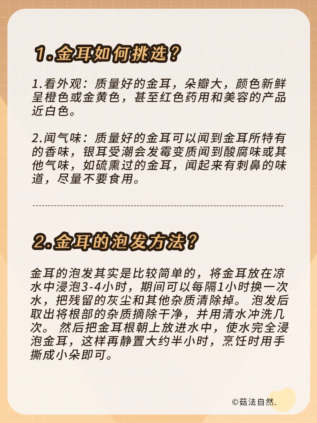 1.看外观:质量好的金耳,朵瓣大,颜色新鲜呈橙色或金黄色,甚至红色药用和美容的产品近白色。