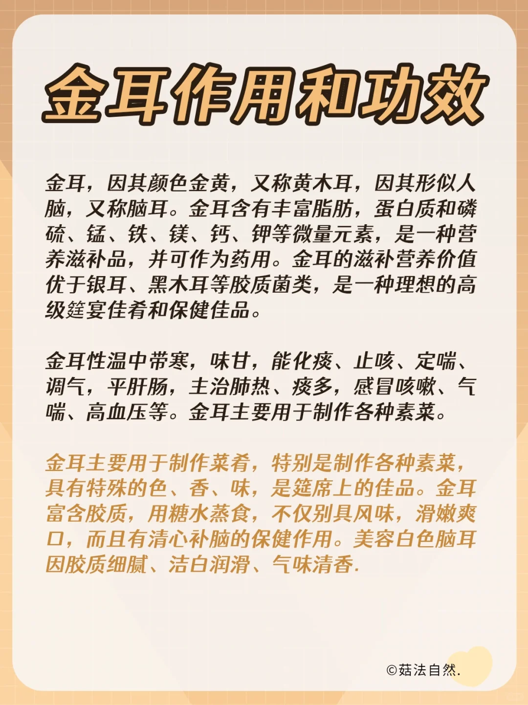 🔍 金耳,因其颜色金黄,又称黄木耳,因其形似人脑,又称脑耳。金耳含有丰富脂肪,蛋白质和磷硫、锰、铁、镁、钙、钾等微量元素,是一种营养滋补品,并可作为药用。金耳的滋补营养价值优于银耳、黑木耳等胶质菌类,是一种理想的高级筳宴佳肴和保健佳品。