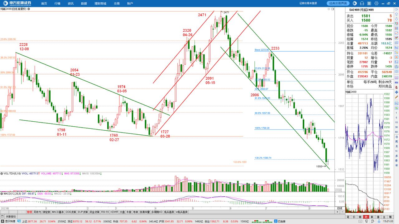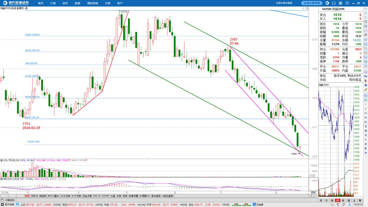 SA2501 纯碱 (Sodium cArbonate) 第一部分:不可违反的原则 按短线顶部2345以来的紫色下跌通道短线看空,用图中的两组黄金分割线逐线预测下跌进程,直到突破出现为止。 第二部分:尚待验证的猜测 1、2345以来沿紫色通道的下跌,是中级顶部3648@2021-10以来的中级熊市的一个下跌推动浪的第三浪下跌; 2、从紫色上轨与蓝色的80.9%黄金分割线@1817交汇位置开始的、最近9个交易日的下跌,是紫色通道内的第5浪下跌;最近日线6连阴的下跌,是前述第5浪的第3子浪下跌; 3、未来若出日阳线,则很可能是第5浪下跌中的第4子浪反弹,但预测反弹不会超出紫色上轨,反弹结束之后,价格会继续第5浪的第5子浪下跌; 4、第5子浪下跌若跌到符合波浪理论三原则猜底的地方,则可能是短线底部!