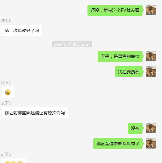 但是曲绘依旧是问题,不得已直接用了李博那边的图,因为有源文件。李博的同人曲和曲绘,从去年3.12就开始筹备了,所以有高精度,期间多次和猛腩老师沟通细节。