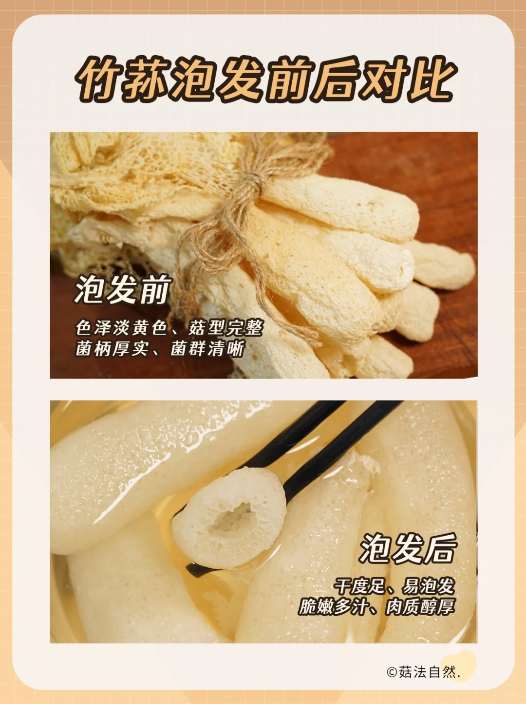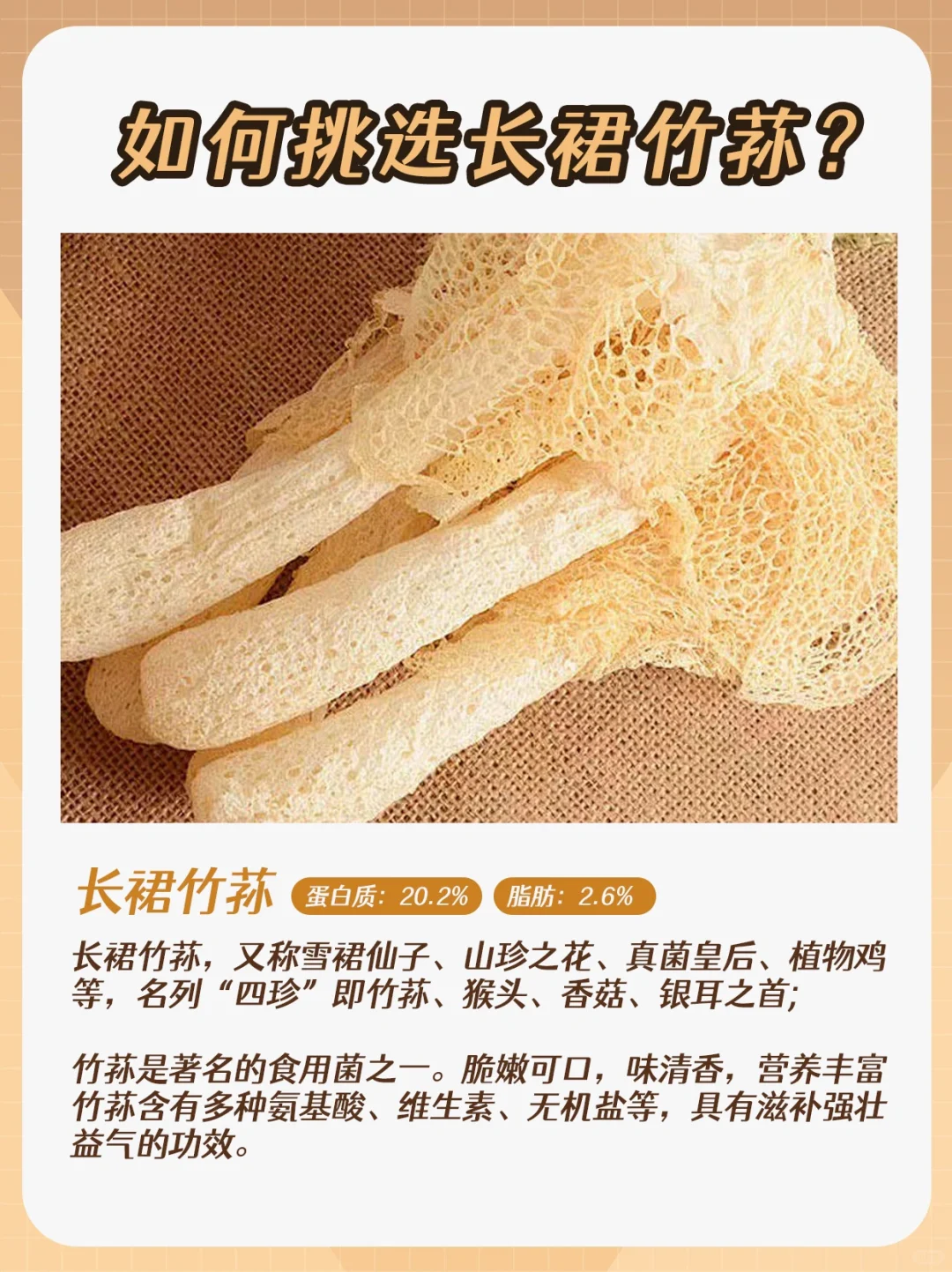 🔍 长裙竹荪,又称雪裙仙子、山珍之花、真菌皇后、植物等,名列“四珍”即竹荪、猴头、香菇、银耳之首~ ✅ 1.看颜色: 优质竹荪为淡黄色,竹荪多糖会与氧气结合,黄色会变得深,硫熏竹荪非常白,为了看上去更漂亮,长时间保持不变色. ✅2.闻味道:优质竹荪打开包装后是一种淡淡的鲜香味道,硫熏竹荪打开包装后一股刺激性气味扑面而来,非常难闻 添加剂、防腐剂导致~ ✅3.看泡发:优质竹荪泡发后质密饱满,清洗杂质时,菌杆韧性强不易碎断硫熏的竹荪泡发后,质稀孔大,清洗时容易碎断~
