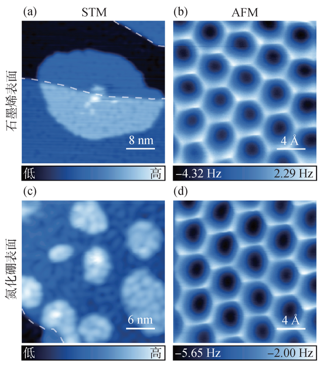 图4 石墨烯和氮化硼表面的二维冰结构 (a,b)石墨烯表面二维冰的恒流扫描隧道显微镜(STM)图像和恒高原子力显微镜(AFM)图像;(c,d)氮化硼表面二维冰的恒流STM图像和恒高AFM图像