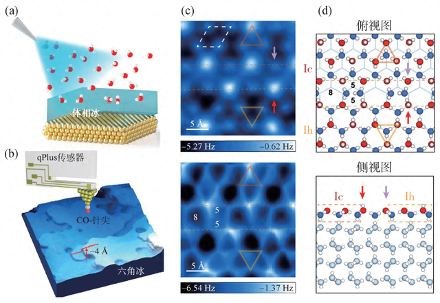 图1 六角冰表面的高分辨成像 (a,b)六角冰生长过程及冰表面成像的示意图;(c,d)在不同成像力区间时,六角冰表面不同堆积方式下的原子力显微镜实验图及其原子模型图。六角密堆积(Ih)堆叠和立方密堆积(Ic)堆叠分别由黄色和橙色线条标记,H-up和O-up的水分子分别由红色和紫色箭头标记