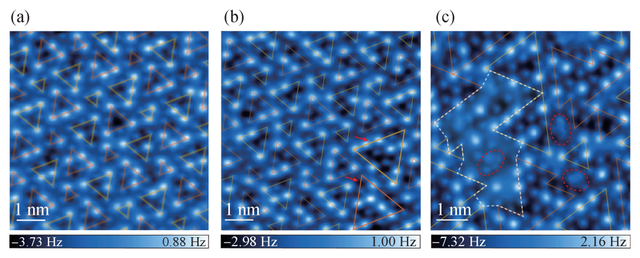 图3 随着温度升高,冰表面预融化过程的原子级分辨成像 在120 K(a)、123 K(b)、125 K(c)条件下生长的冰表面的原子力显微镜实验图,随着温度升高,冰表面逐渐变得无序。无序区域由白色虚线标记,Ih堆叠和Ic堆叠分别用黄色和橙色线条标记,平面化团簇结构则由红色虚线椭圆标记