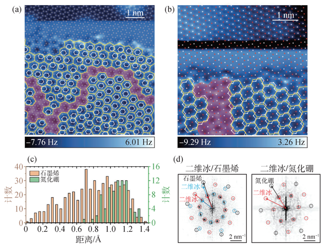 图5 二维冰公度性差异 (a)石墨烯表面二维冰的晶畴图像,以及石墨烯晶格和二维冰晶格匹配关系,其中晶界由紫色标出,灰点表示碳原子,黄线标出水的氢键网络,白线标出衬底的碳六元环;(b)氮化硼表面二维冰的晶畴图像,以及氮化硼晶格和二维冰晶格匹配关系,其中晶界由紫色标出,白点和红点分别表示硼原子和氮原子,黄线标出水的氢键网络,白线标出衬底的硼氮十四元环;(c)水六元环与衬底碳六元环和硼氮六元环之间的特征距离统计;(d)石墨烯和氮化硼及其表面二维冰晶格的快速傅里叶变换图像