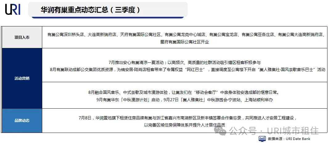 品牌排名上,半年度位列第4,三季度依旧稳居该位次,规模的稳步增长进一步巩固了其头部阵营地位。同时,有巢在运营端通过多元活动营销(如7月“安心有巢清凉一夏”社群活动、8月成都“网红巴士·国风茶歇音乐巴士”活动、9月华东“中秋漫游计划”等)增强租客粘性,品牌端还与嘉兴南湖新区签署合作备忘录推进人才安居工程,从规模、运营、品牌多维度夯实行业竞争力。
