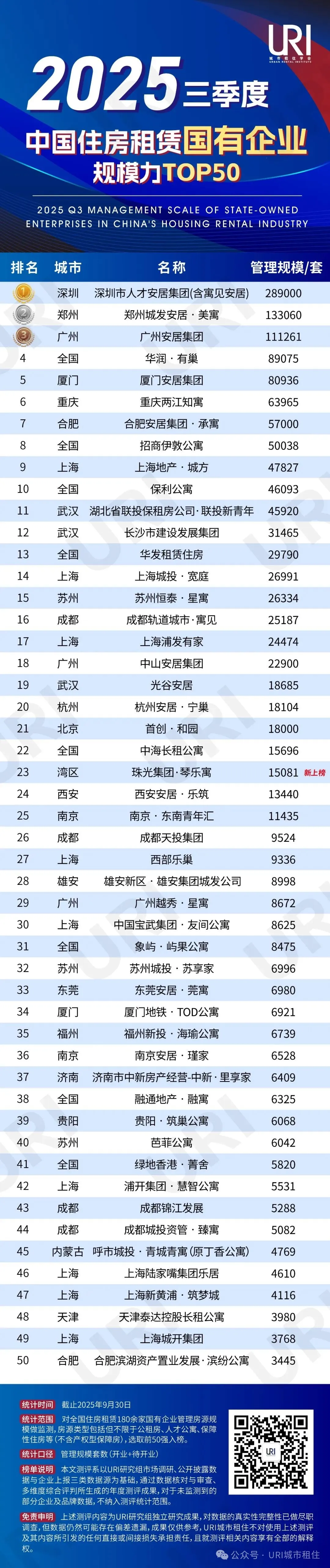 增长企业数量有限:在TOP50中,仅7家企业规模实现正增长,2家企业出现负增长,1家企业为新增入榜(珠海集团·琴乐寓15081间),其余40家企业规模几乎与半年度持平。这表明三季度国有企业住房租赁规模扩张较为谨慎,可能受政策调控、资金投入周期等因素影响。