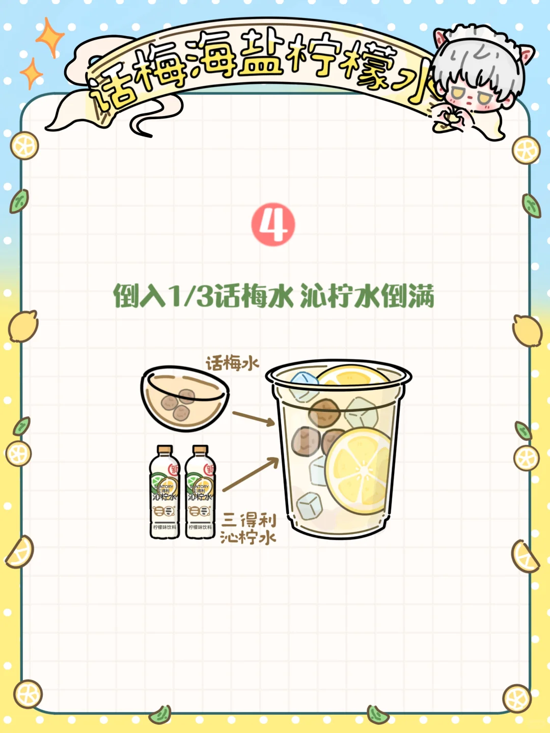 4⃣倒入三分之一话梅水,三得利沁柠水倒满