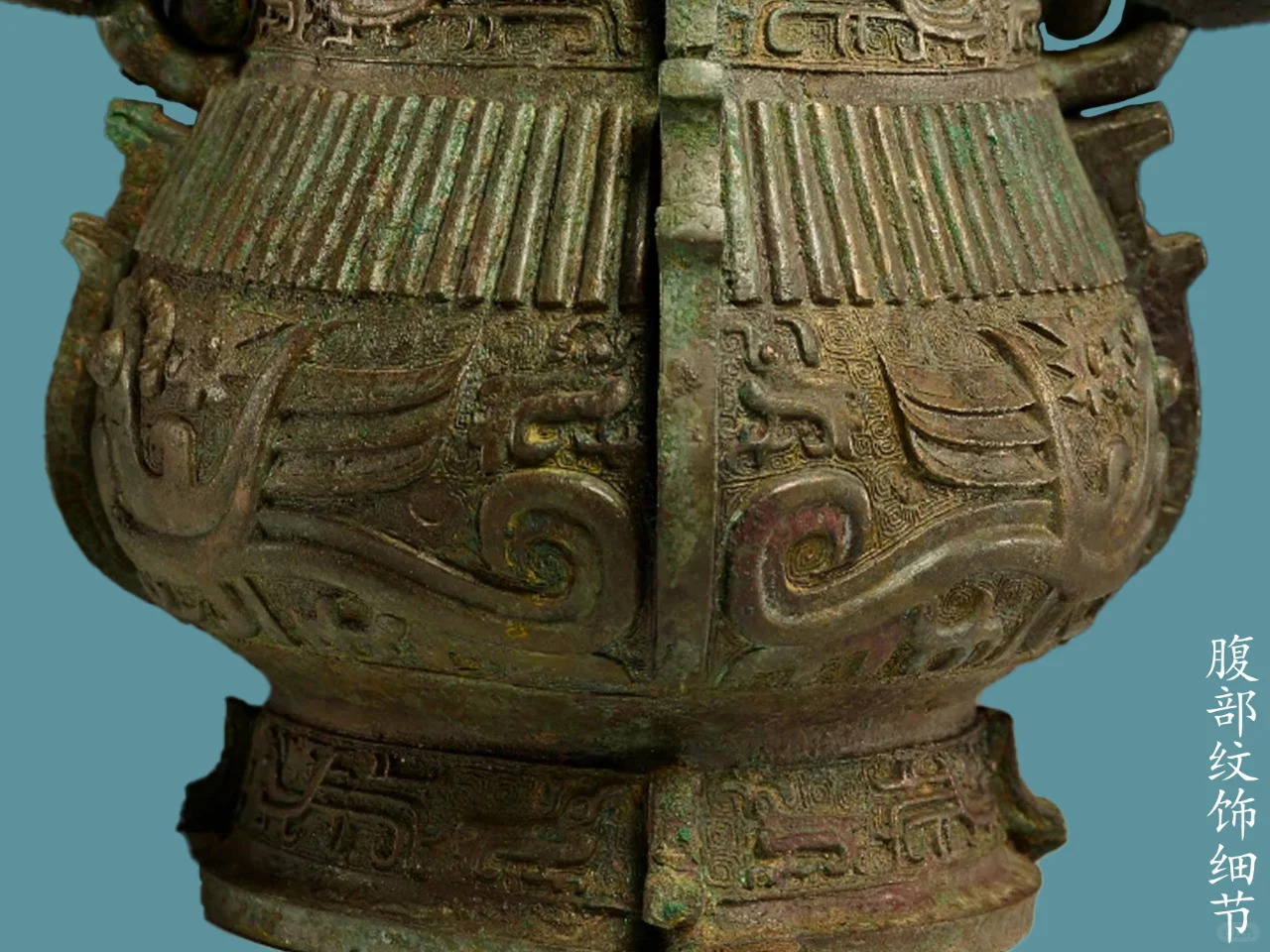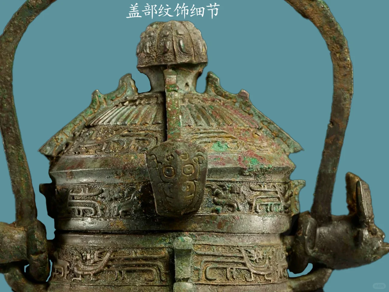 自口至足有四道扉棱,盖面顶部置花蕾六瓣状,每瓣饰蝉纹,钮下部饰一周四组四只两两相对的垂尾鸟纹,其外饰一周竖棱纹,盖边缘饰一周四组八只鸟,幼鸟与垂尾鸟纹一组,幼鸟两两相对 ,盖边沿纹饰与边缘纹饰一致,只是组合方向不同。腹上部饰一字四组八只鸟,与盖边缘纹饰一致且方向相同。腹部中间饰一周竖棱纹,其上饰一周四组八只鸟纹,其长羽鸟纹为主,羽后饰幼鸟纹,幼鸟两两相对,圈足饰一周四组八只鸟纹,与盖沿处纹饰相同。整器以云雷纹衬地。