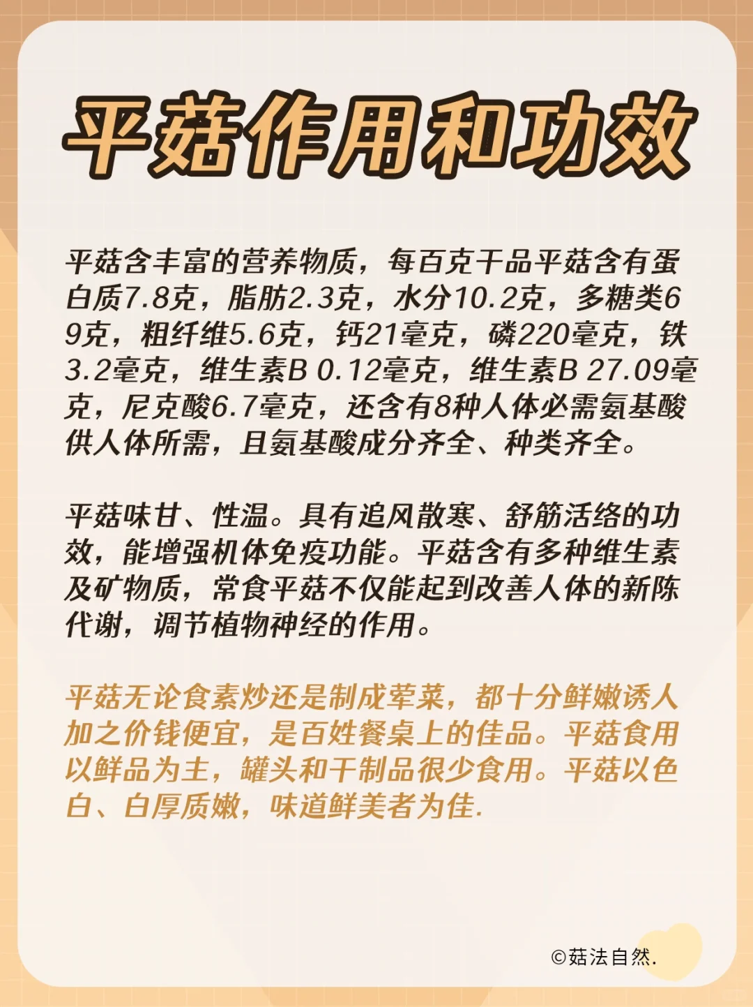 🔍 平菇菌盖肉质肥厚柔软,菌褶白色,长短不一,长的 由菌盖边缘一直延伸到菌柄,形如扇骨。含丰富的营养物质,口感紧实、淡淡清香,改善人体新陈代谢,可煲汤、小炒、煎炸. ✅富含丰富的蛋白质、氨基酸、维生素等矿物质元素 ✅ 平菇味甘、性温。具有追风散寒、舒筋活络的功效,能增强机体免疫功能。平菇含有多种维生素及矿物质,常食平菇不仅能起到改善人体的新陈代谢,调节植物神经的作用。