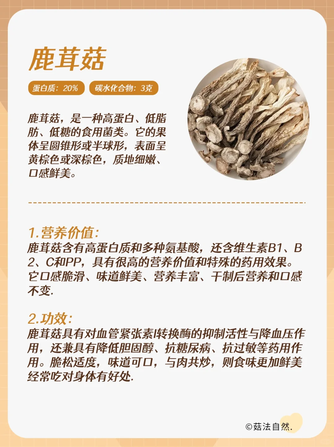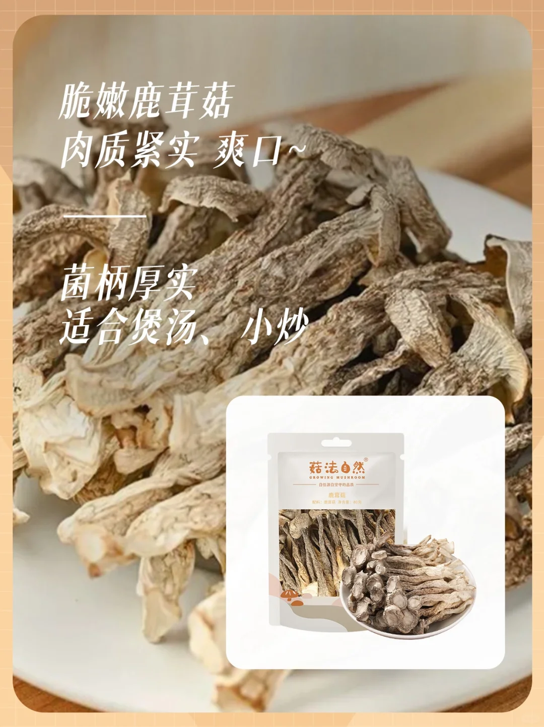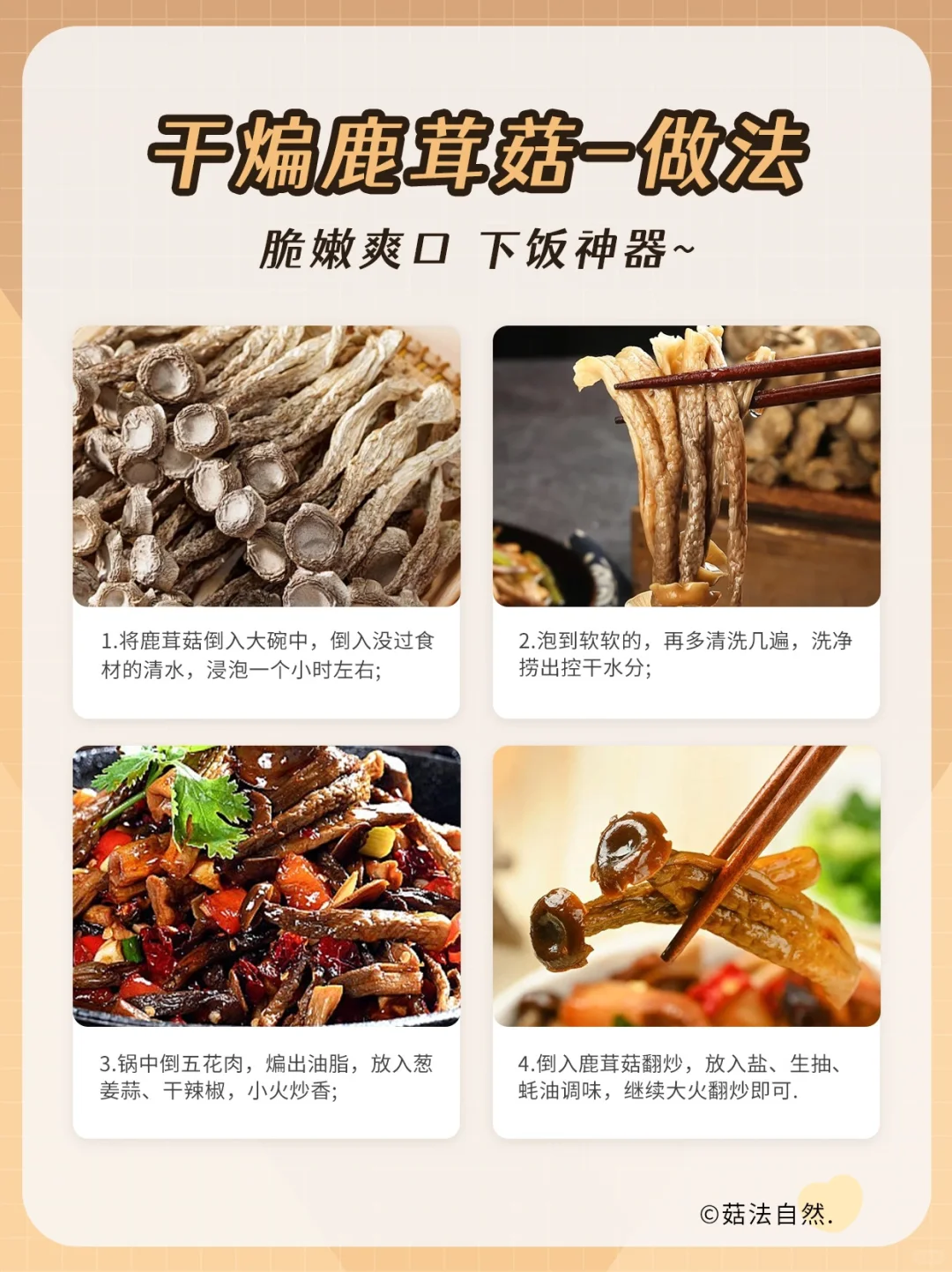 🔔烹饪小贴士:干鹿茸菇记得提前泡发30分钟−1小时左右,这样烹饪出来的菜更鲜嫩.