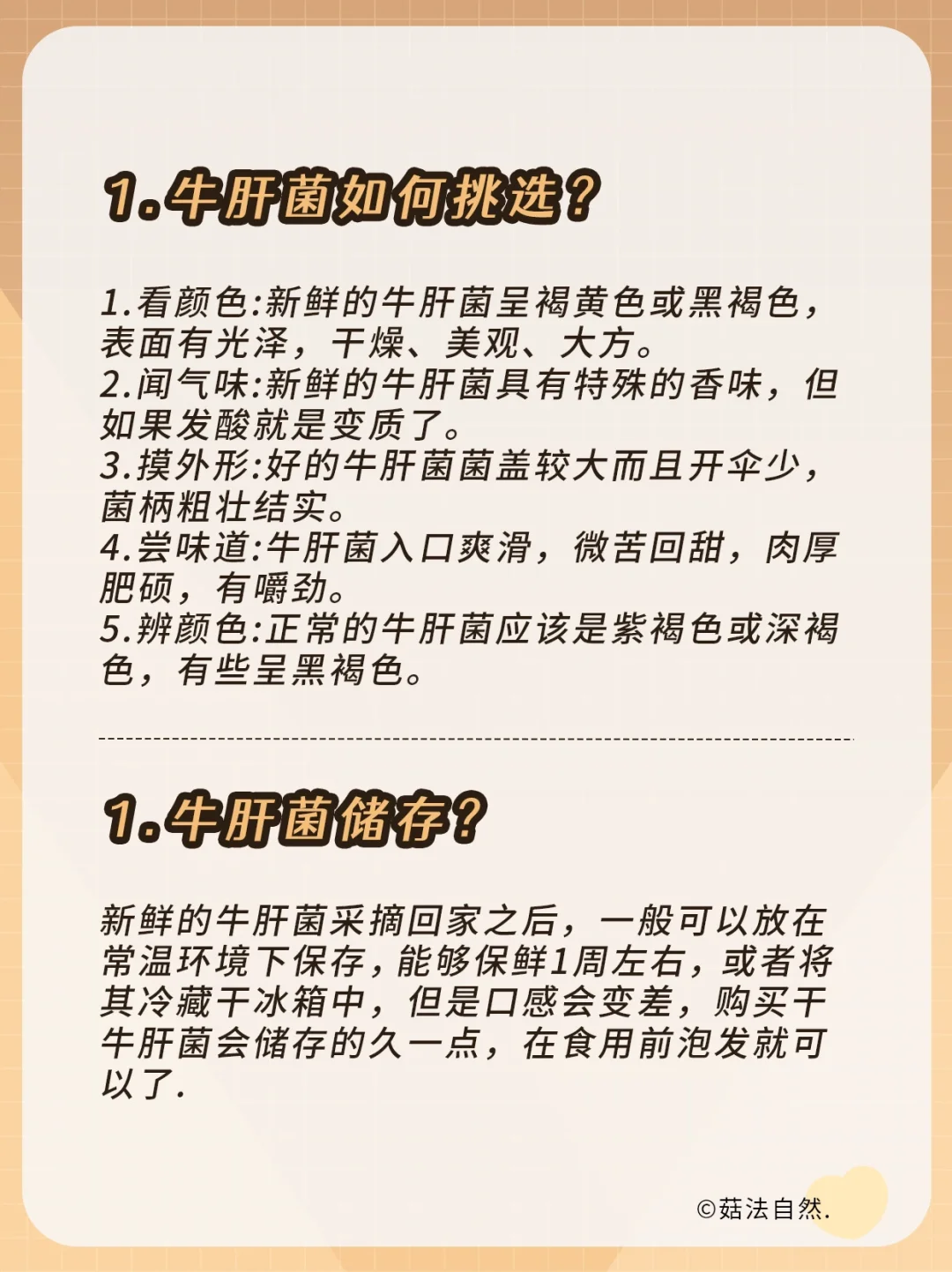 1.看颜色:新鲜的牛肝菌呈褐黄色或黑褐色,表面有光泽,干燥、美观、大方。