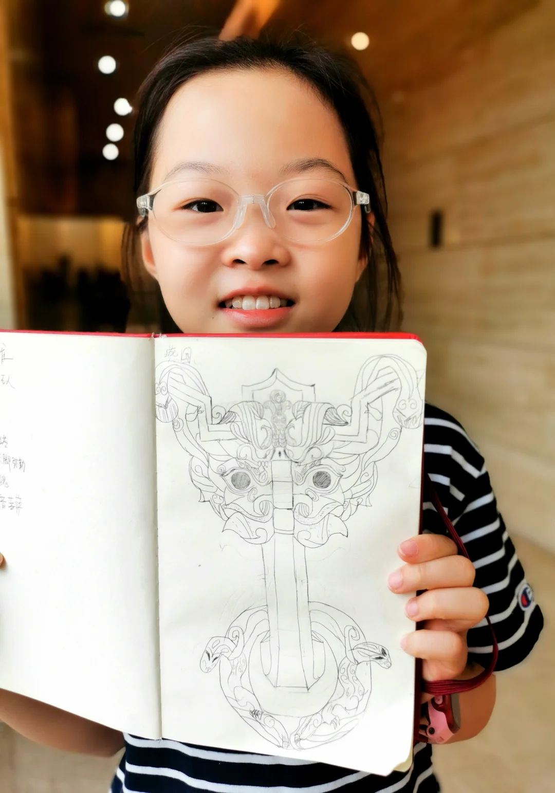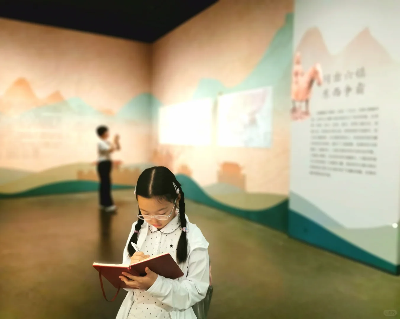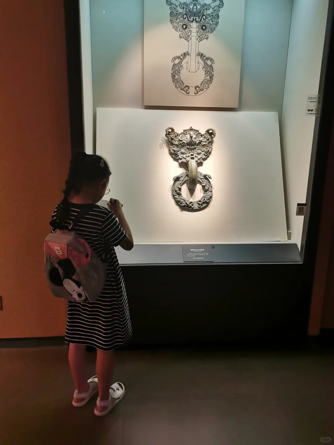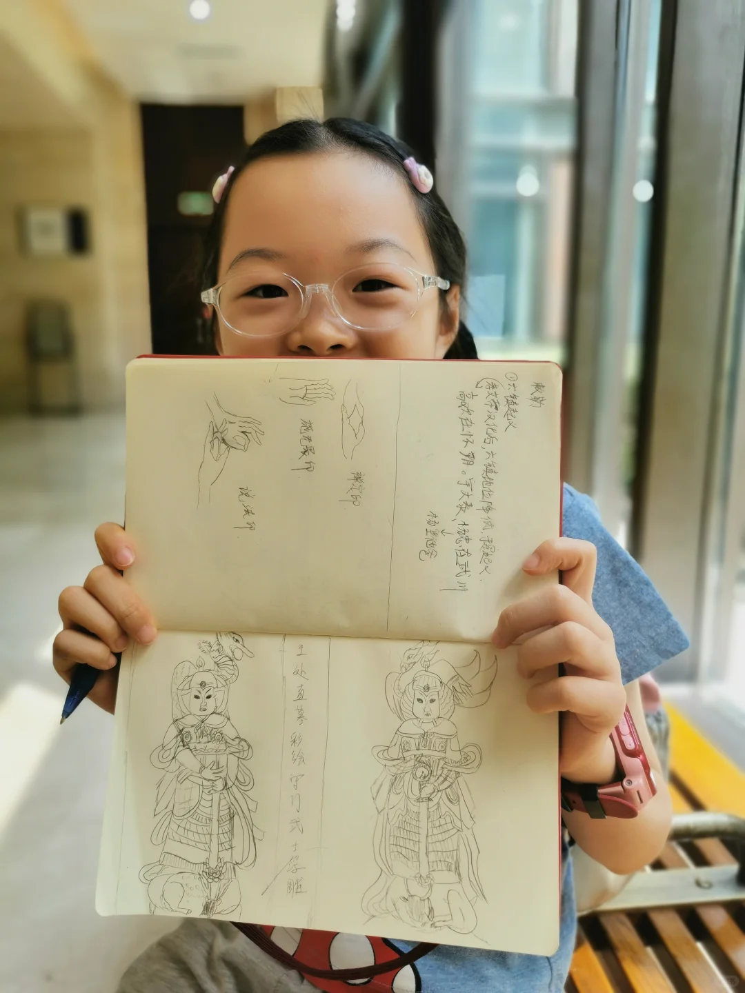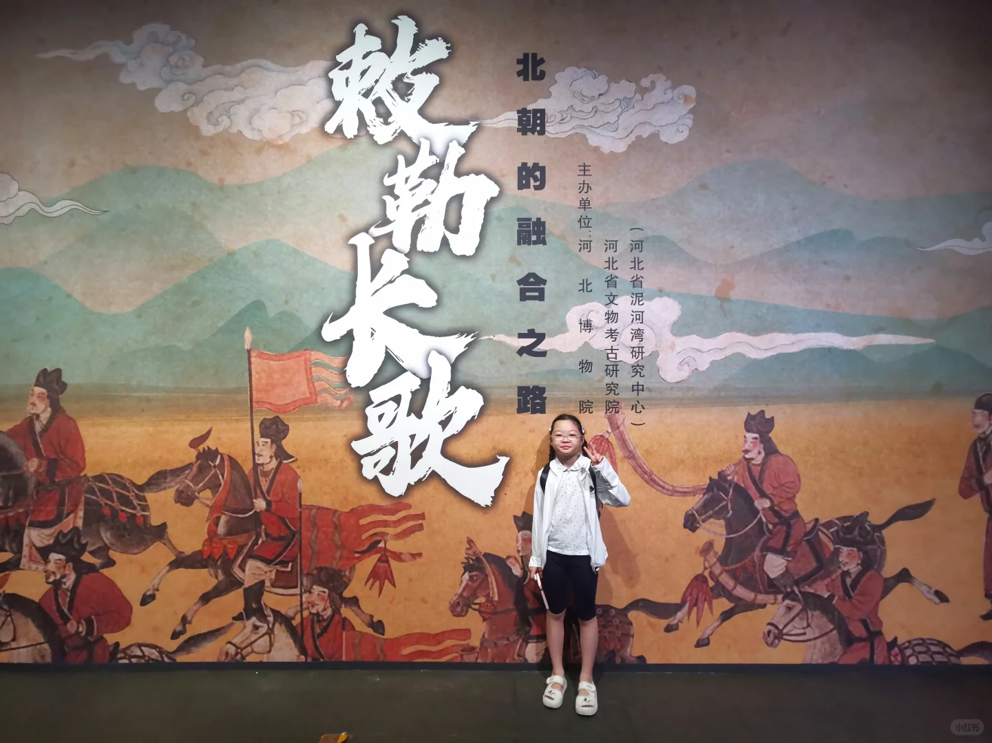 娃实现了在博物馆里自主参观,不吵不闹全身心沉浸,自得其乐,这对当妈的来说是种什么样的体验呢?简直不要太爽了! 这次来河北博物院,主要是为了《敕勒长歌》这个展,顺便再把其他展厅复习一遍。 现在带劢看展已经非常轻松,她基本能跟我同步看一个新展了。看展就是看逻辑,看展要先看展线!这一点这家伙现在贯彻的不错。 《敕勒长歌》前面的部分独立看下来对她来说不容易。六镇起义、北魏如何分裂到东、西魏,如何被北齐、北周分别替代这一大部分还好。但是这之中,更为具体的细节和人物关系比较复杂,再加上作为论据的文物很多都是墓志,别说对她,有些对我都是挑战。但是可喜的是,她已经能和我一起边看边讨论,从打酱油的小跟班儿变成了看展搭子。 《敕勒长歌》看下来用了一天半的时间,剩下半天,我和河北博物院的志愿者老师们交流学习,她自己跑去楼下看了《珍奇生灵——濒危动物展》。 我们又用了1.5天,我们一起复习了北朝壁画、两个中山、燕赵悲歌。最后的1.5天,她戴好手表基本就是单飞状态了,自己记笔记,用虫镜看青铜器的纹饰、看玉器的纹饰、看金器的细节,然后就是各种画,随心所欲地画她的心头爱们。另外,特别要说一下《燕赵悲歌》赵国那部分的成语剧场部分,孩子可以戴上耳机沉浸在成语典故的世界里,尽情学习相关的文史知识。每个展厅内的纪录片,她都认真看了两遍以上。我就可以踏实做我的工作,保存资料。