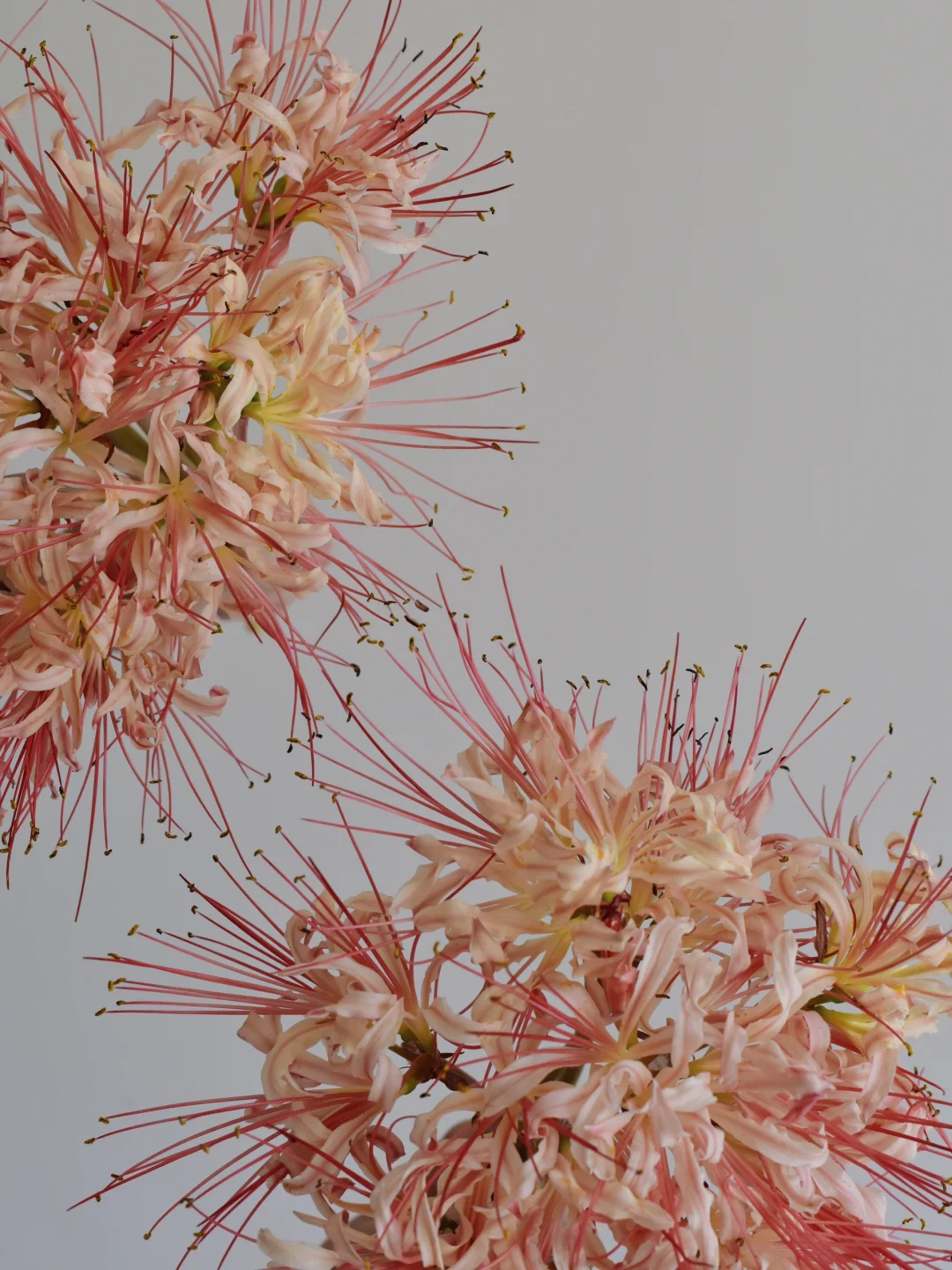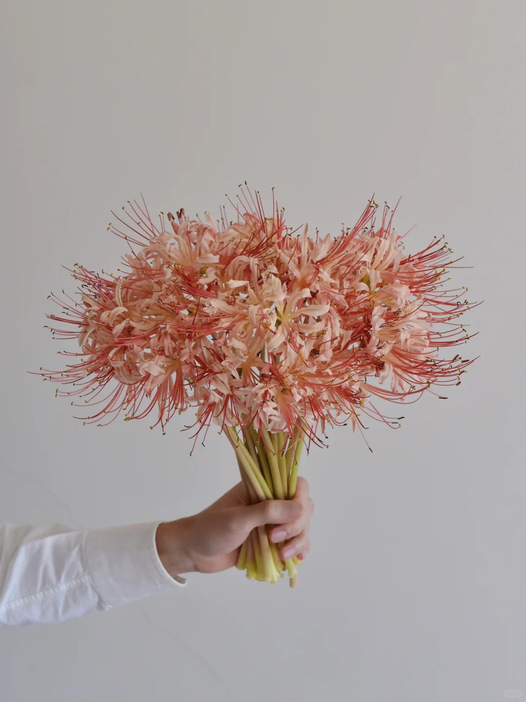 哎哟,这石蒜颜色玩得比变色龙还溜,鲑鱼色还能长睫毛,花艺界的新晋网红呗?