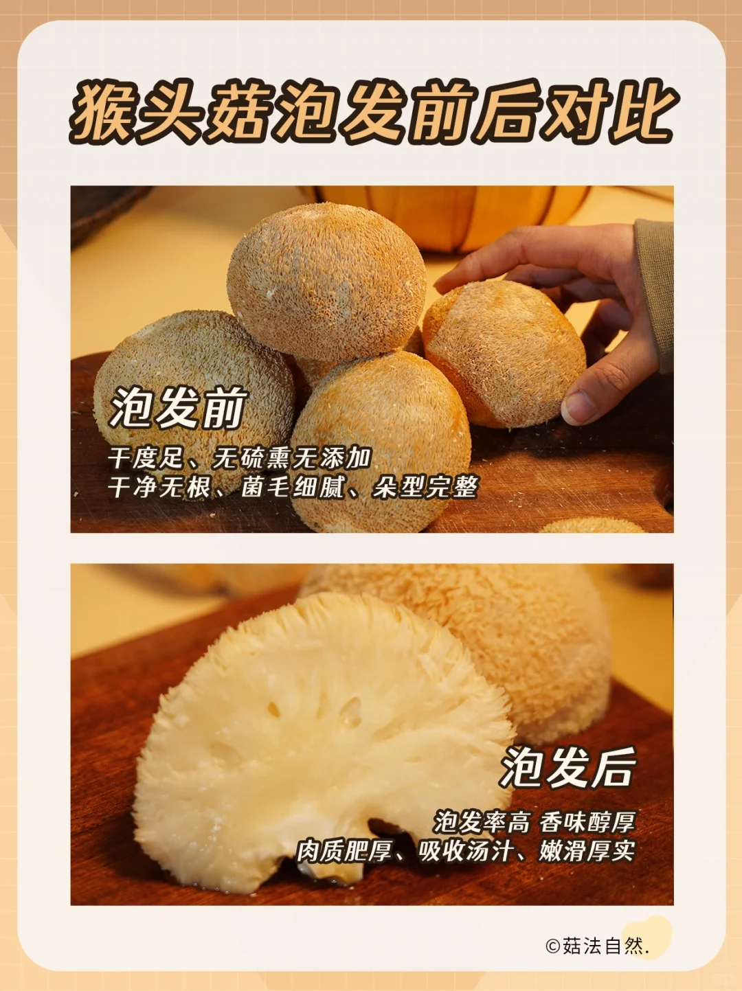 ✅1.看颜色 干猴头菇品质好的外观呈金黄色,像金丝猴的茸毛一样,有微微菌丝呈白色~ ✅2.看外形: 形状近似圆形,直经大约在4—5cm左右,没有伤痕残缺而且大小均匀~ ✅3.看茸毛: 优质的猴头菇,茸毛细长齐全,分布均匀厚密,茸毛齐全的猴头菇质量更好~ ✅4.看湿度: 猴头菇在湿的情况下一般为淡黄色的,只有干制后才是现在常见的金黄色~