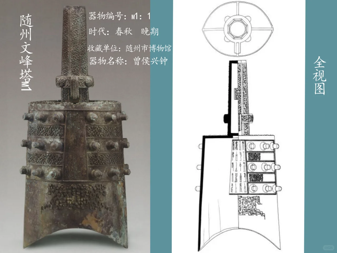 2009年湖北随州文峰塔曾侯與墓出土的M1:1号编钟,形体完整,高大厚重在钟体的正、背面钲部;正面左右鼓、背面左右鼓部上铸有铭文。全钟共有铭文字数 169 个,其中合文1、重文1。铭文阅读顺序为右起左行格式:正面钲部→正面左鼓部→背面右鼓部→背面钲部→背面左鼓部→正面右鼓部。