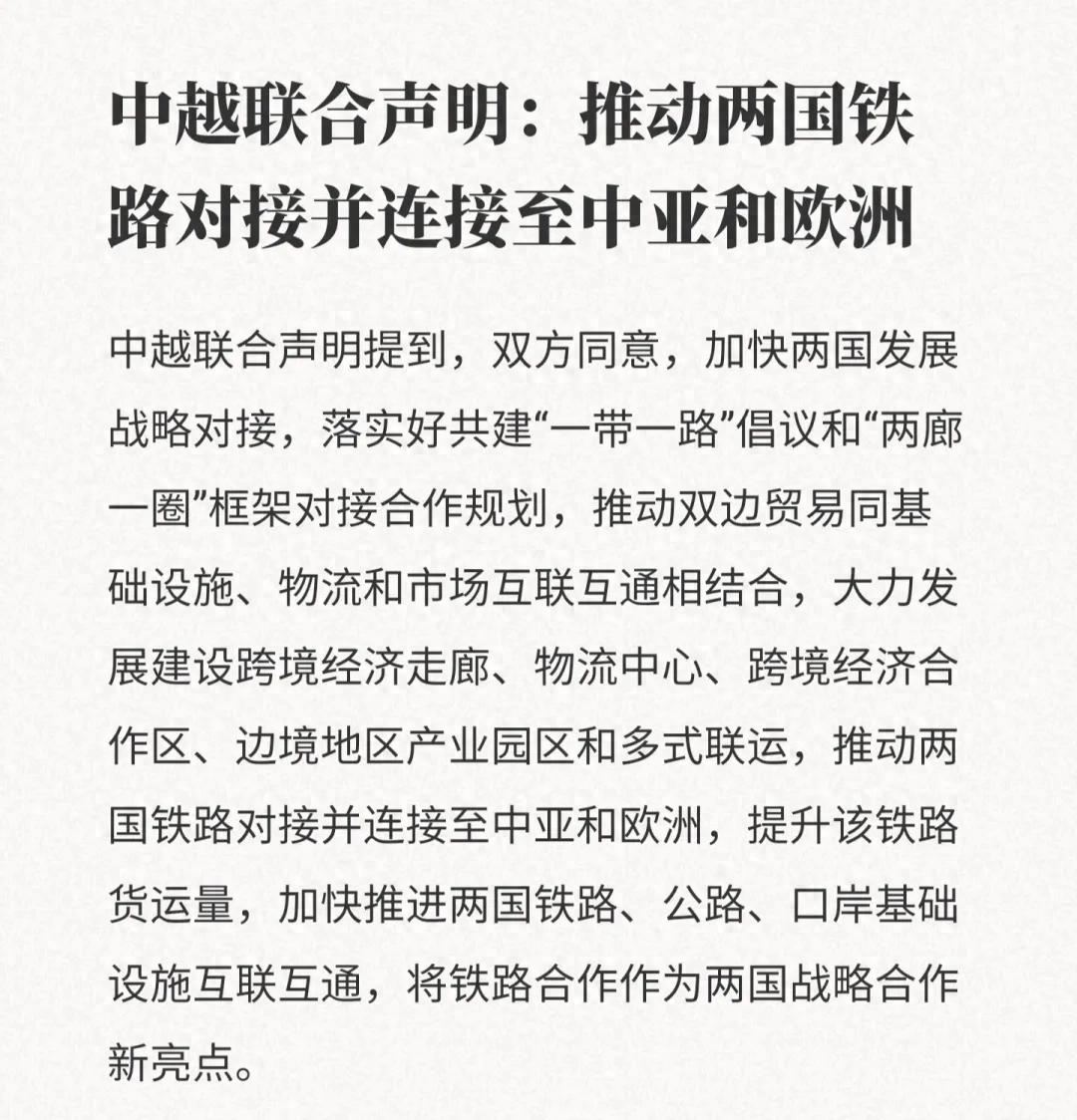 最新发布的中越联合声明提出,推动两国铁路对接并连接至中亚和欧洲,将铁路合作作为两国战略合作新亮点。