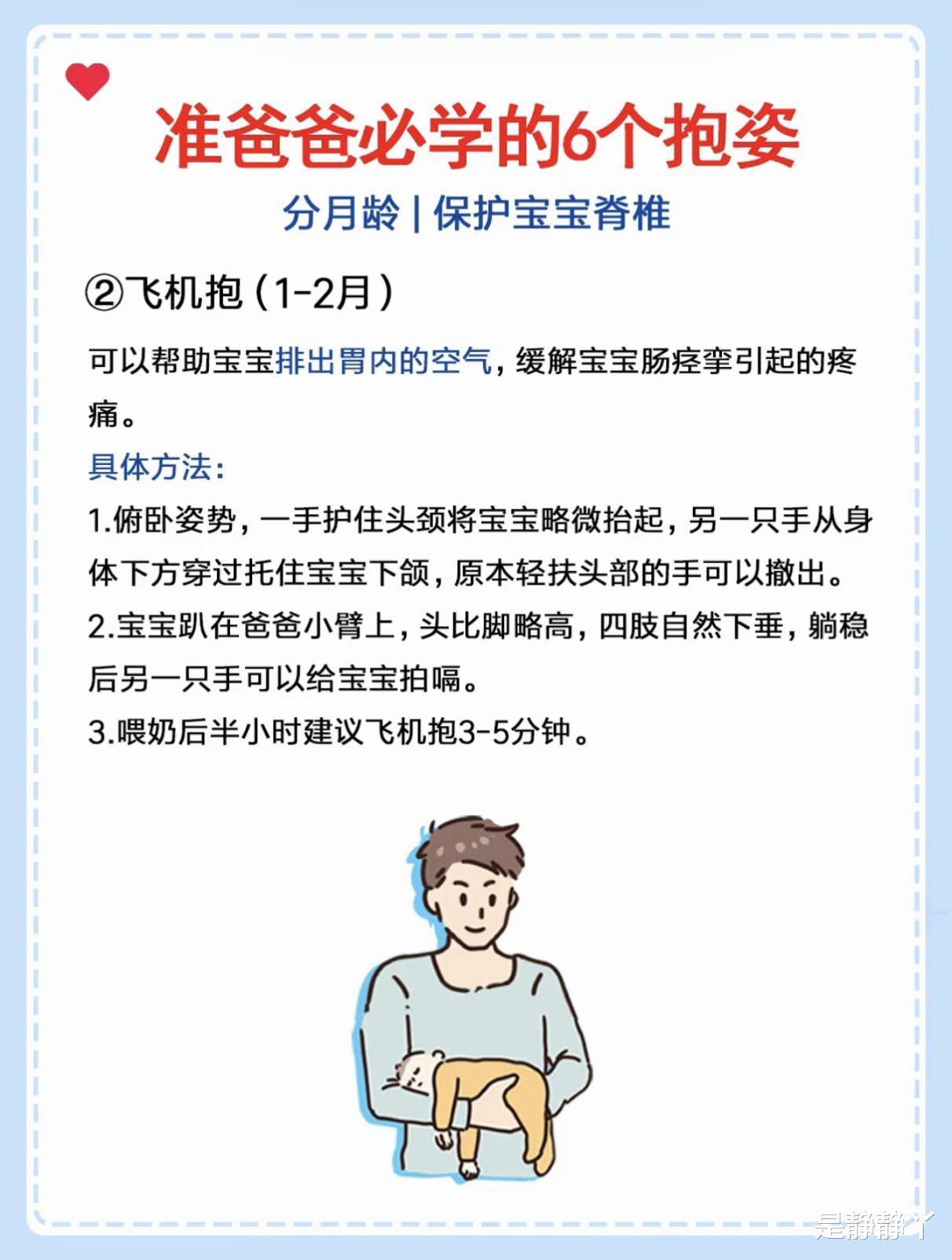 两个月时,宝宝可能会肠胀气,哭闹不止、蹬腿、放屁多。这时飞机抱很有用。爸爸可以让宝宝面朝下趴在前臂上,头朝外,另一只手扶住背部和臀部。这姿势能压迫宝宝腹部,帮助排气,缓解不适。注意托住头颈部,动作轻柔,避免滑落。但飞机抱不宜长时间使用,每次几分钟即可。