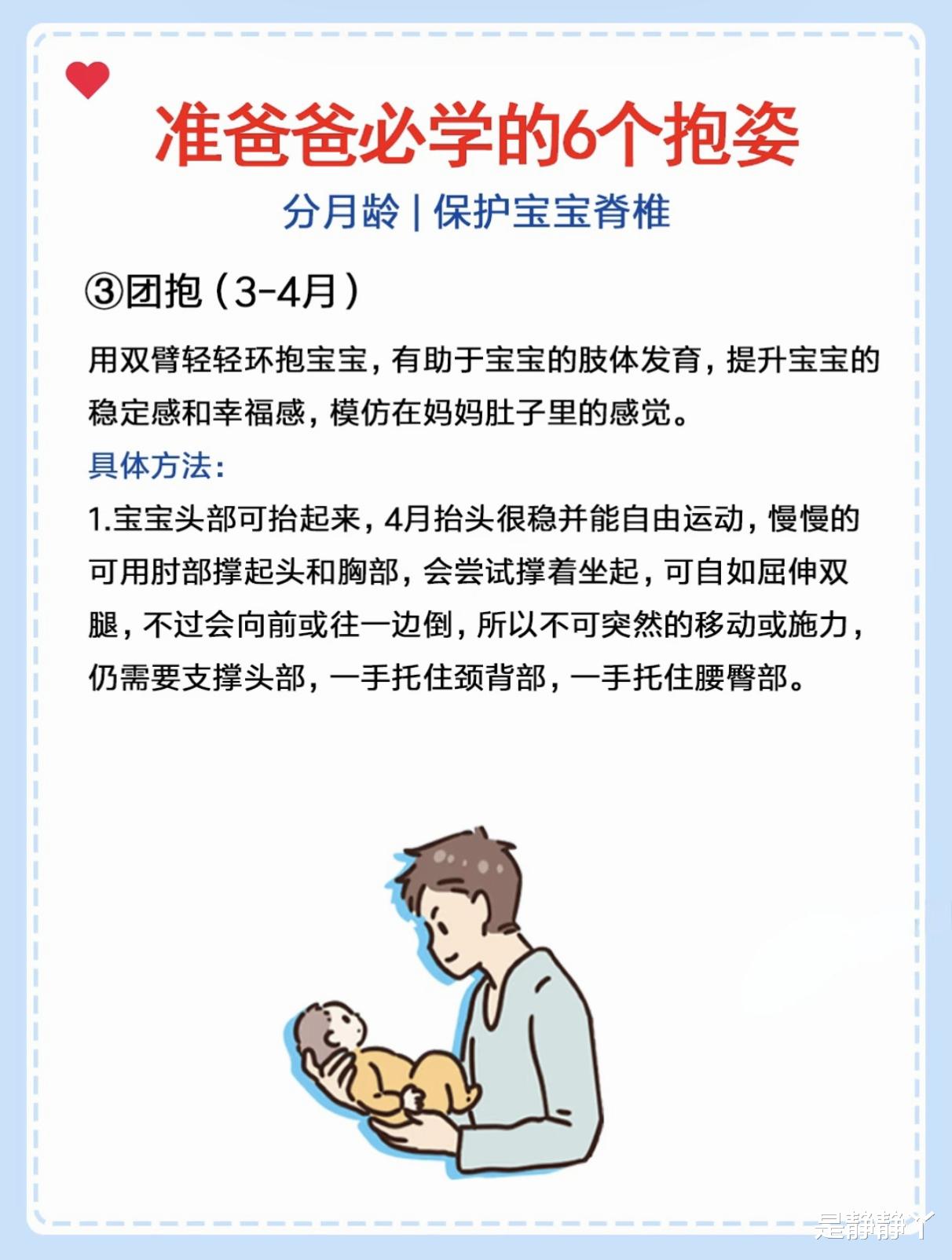 3到4个月的宝宝,颈部力量逐渐增强,开始对周围的世界充满好奇,喜欢东张西望。这时候,团抱是一个不错的选择。爸爸可以将宝宝的身体蜷缩起来,让宝宝的头靠在自己的肩膀上,一只手托住宝宝的臀部,另一只手扶住宝宝的背部和头部。这个姿势能让宝宝的视野更开阔,满足他们的好奇心,同时也能让宝宝感到安全和舒适。团抱时,爸爸要注意让宝宝的头颈部有支撑,避免宝宝头部晃动,同时可以轻轻拍打宝宝的背部,安抚宝宝的情绪。