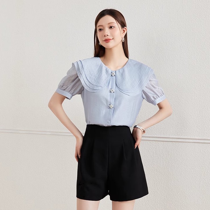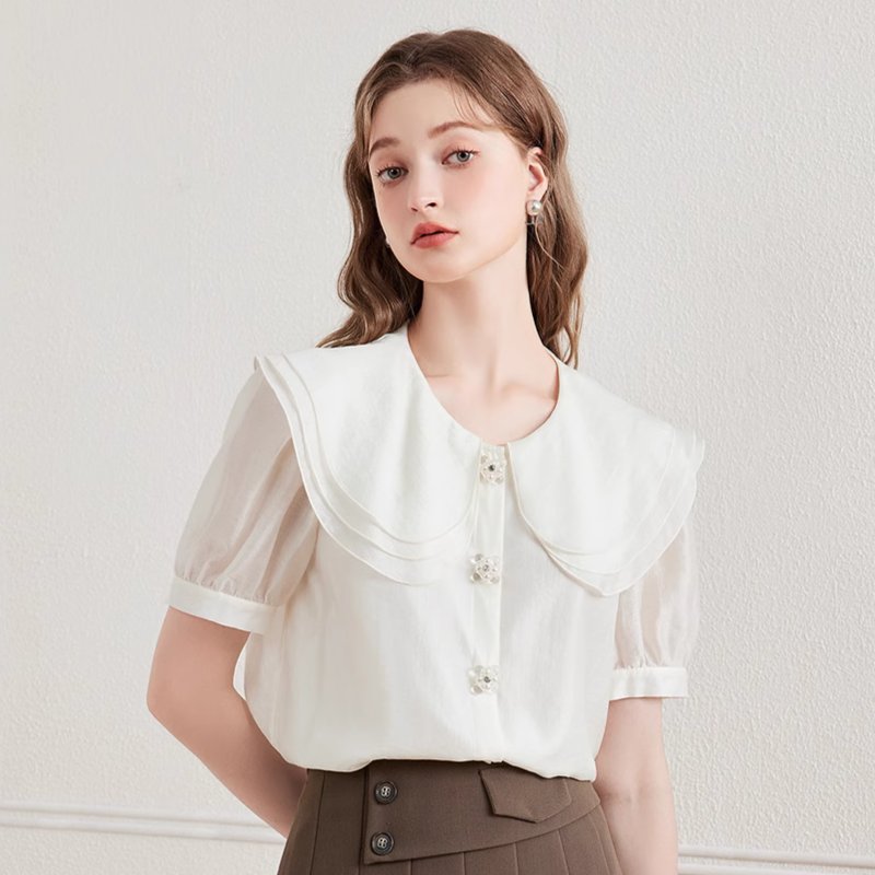 KBNE衬衫女白色短袖娃娃领上衣