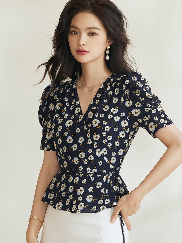 姐妹们,谁懂啊,这个碎花短袖衬衫真的太好看了,腰间这里做了个系带设计,可以随意调节松紧度,还可以扎个蝴蝶结,显得身姿非常细。袖口是泡泡袖设计,显得手臂纤细。衣摆处有褶皱设计,更加凸显女性魅力。