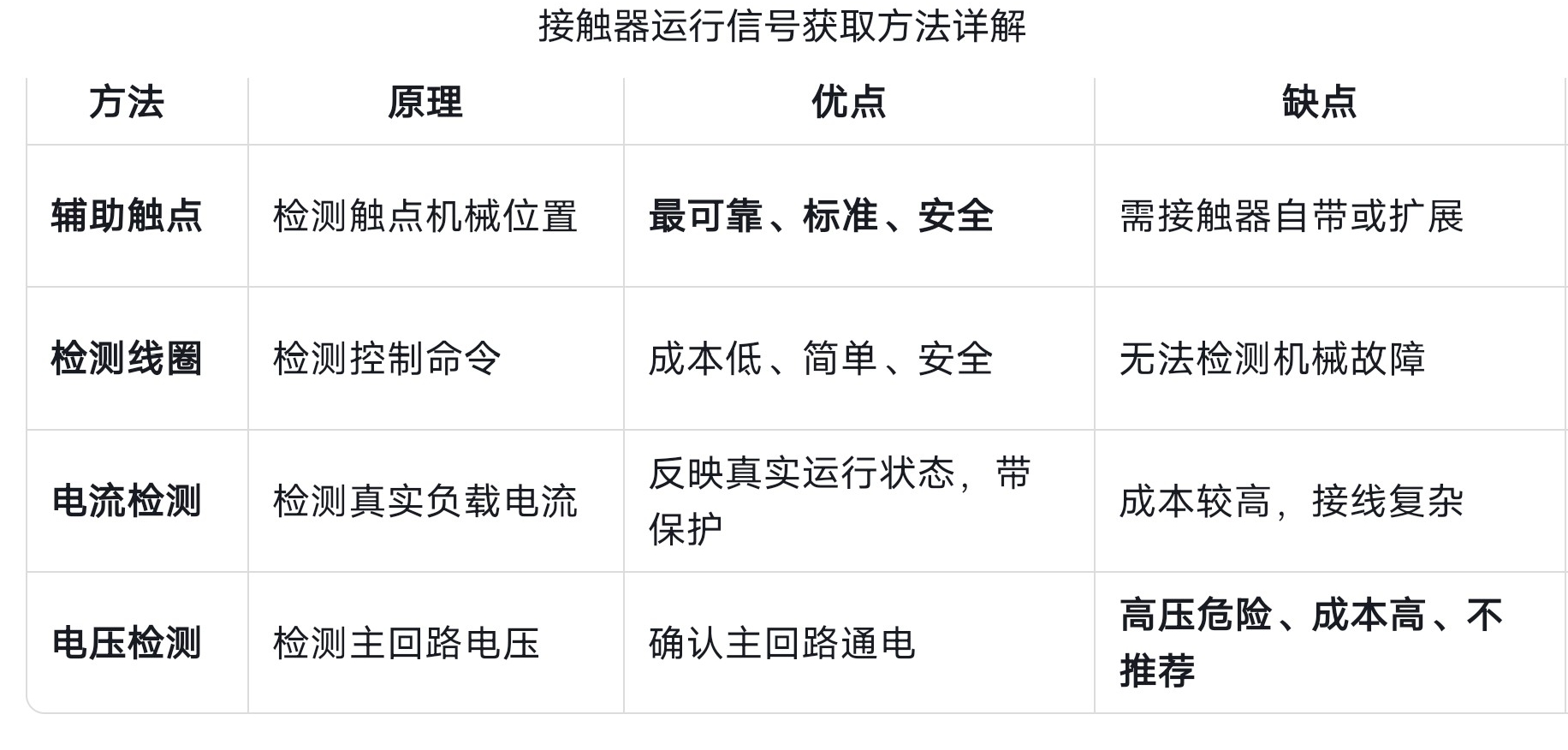 - 优势:能区分“接触器吸合”与“电机空转/堵转”,兼具保护功能;不足:成本较高,接线复杂度增加。