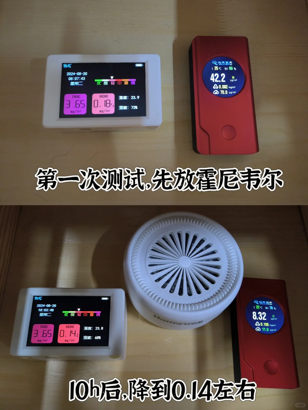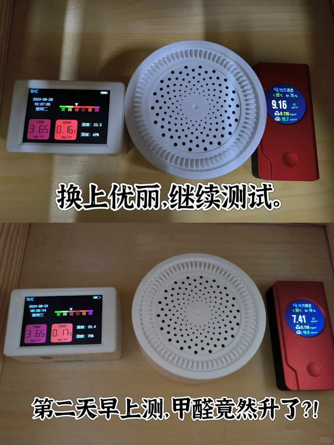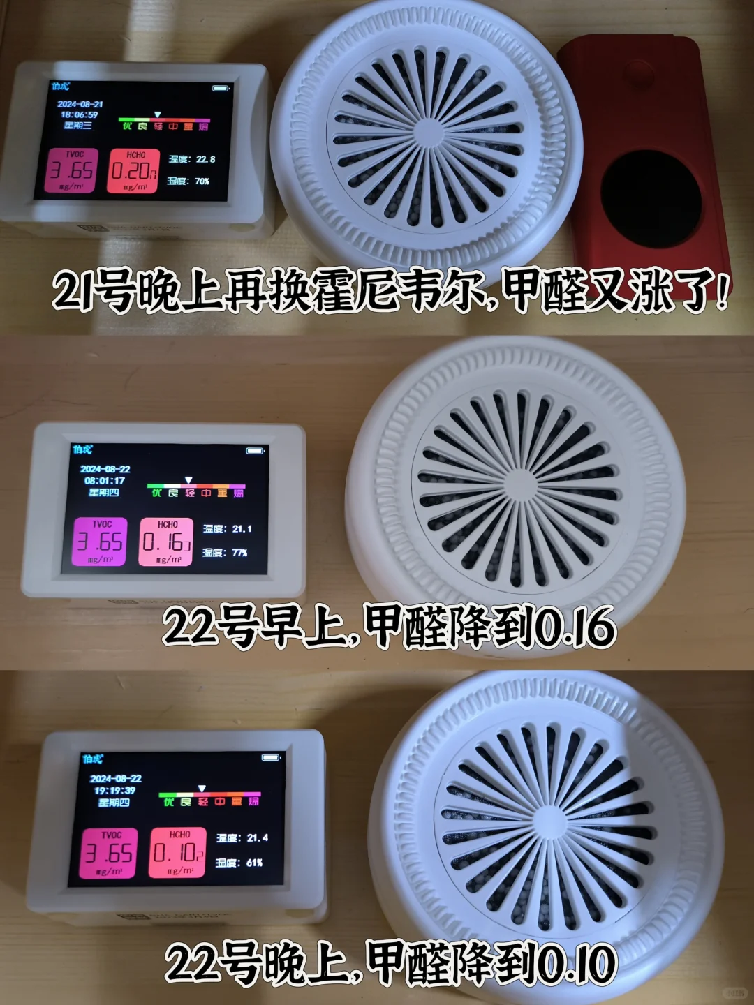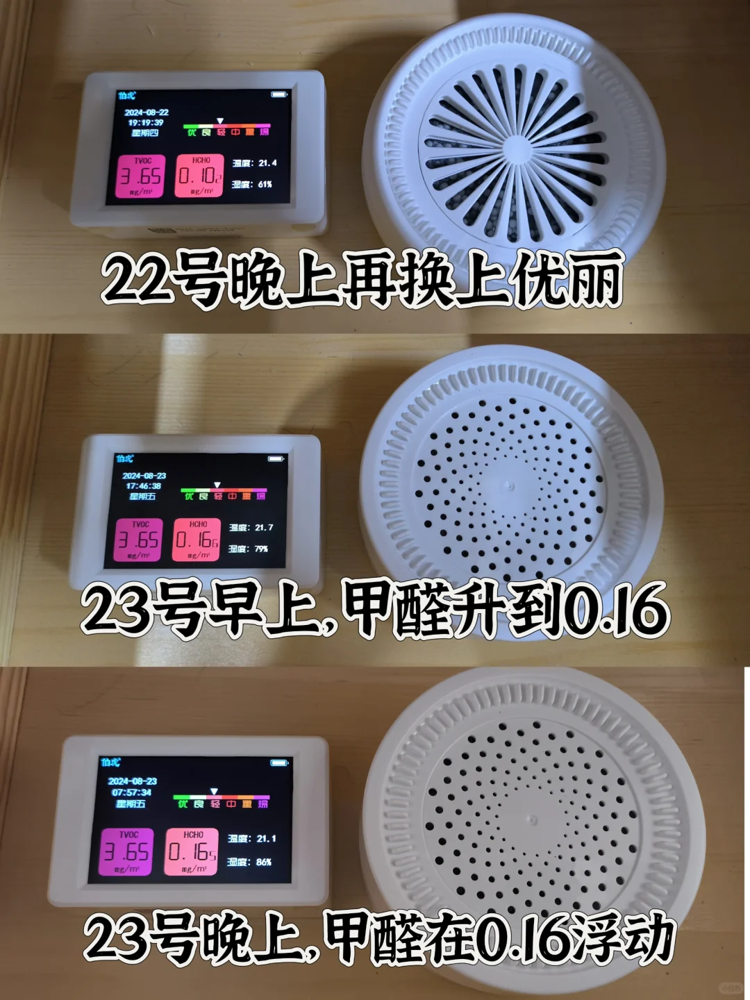 [向右R]结果:时间线就不列了,机器上都显示了,总结下:第一次放霍尼韦尔的时候,晚上明显能看到甲醛的降低,但是换上优丽后,甲醛又回来了。然后再放霍尼韦尔,甲醛又降低了。又换回优丽,甲醛又升高了!