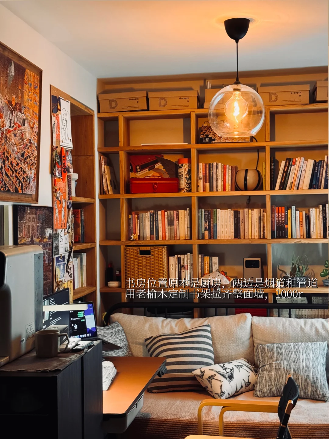 📚 书房,用老榆木定制的书架填补原始户型中烟道和厨房管道造成的凹陷。经济实惠又美观(除了开放式书架不好打扫[哭惹R])