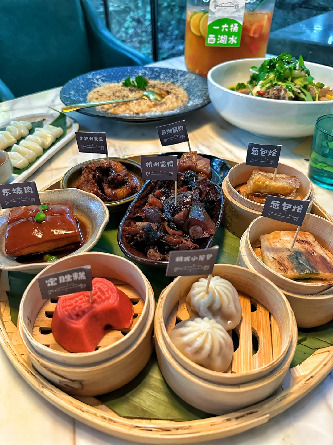 这道菜简直是杭州经典菜的集合,有熏鱼、酱鸭、西湖韵藕、素烧鹅,还有东坡肉、定胜糕、小笼包、葱包烩。一次性就能品尝杭州所有经典美味😋,分量也刚刚好,非常值得一试!
