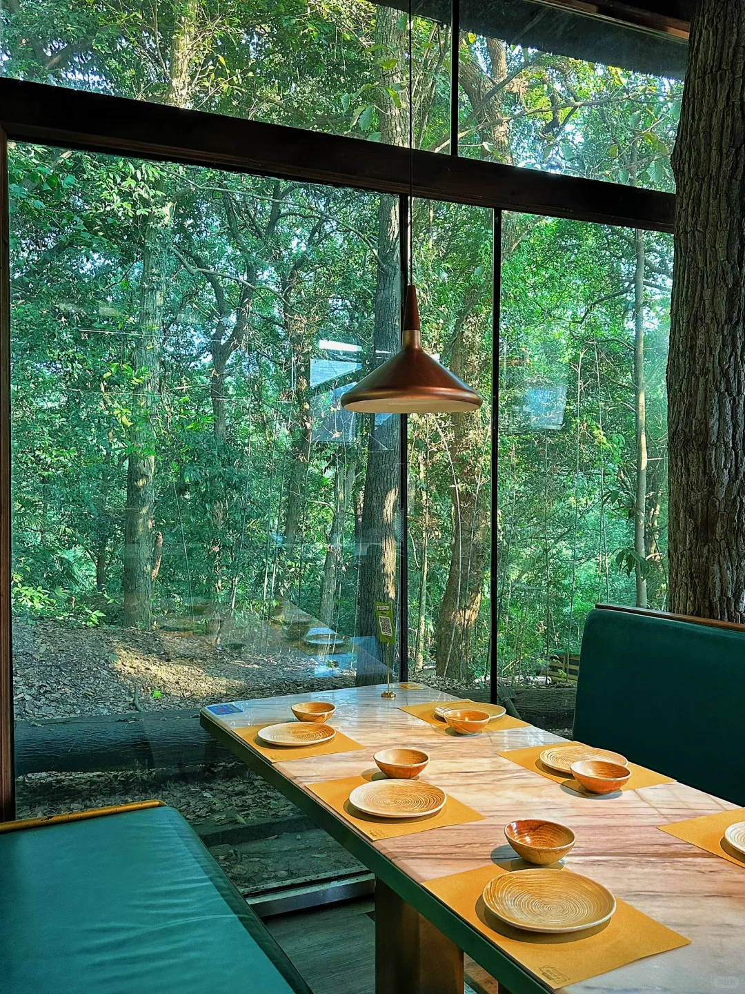 🍃餐厅室内是一个森系风的玻璃房子,香樟树环绕,仿佛置身于森林之中,一眼望去满眼的绿色,在这里吃饭真的太惬意了~