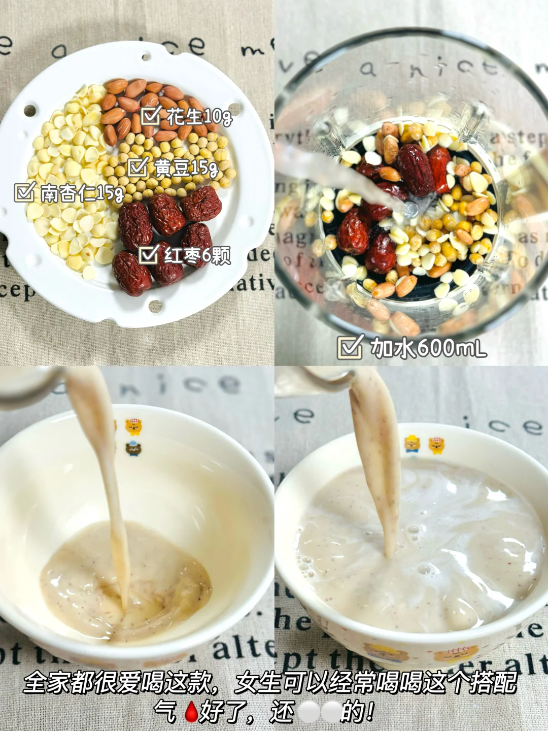 将所有食材放入破壁机中,豆浆模式即可。每款搭配的量加多少水我都✍🏻在图片上,姐妹们看一下。